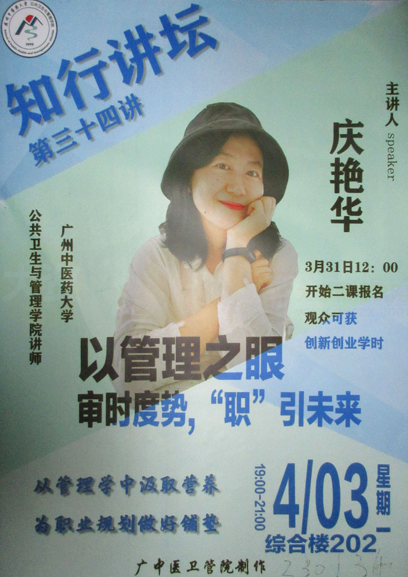 知行讲坛第34讲 主题-以管理之眼 审时度势,职引未来 开讲时间2023.04.03周一晚 教学区综合楼202 主讲-庆艳华 | ||||||