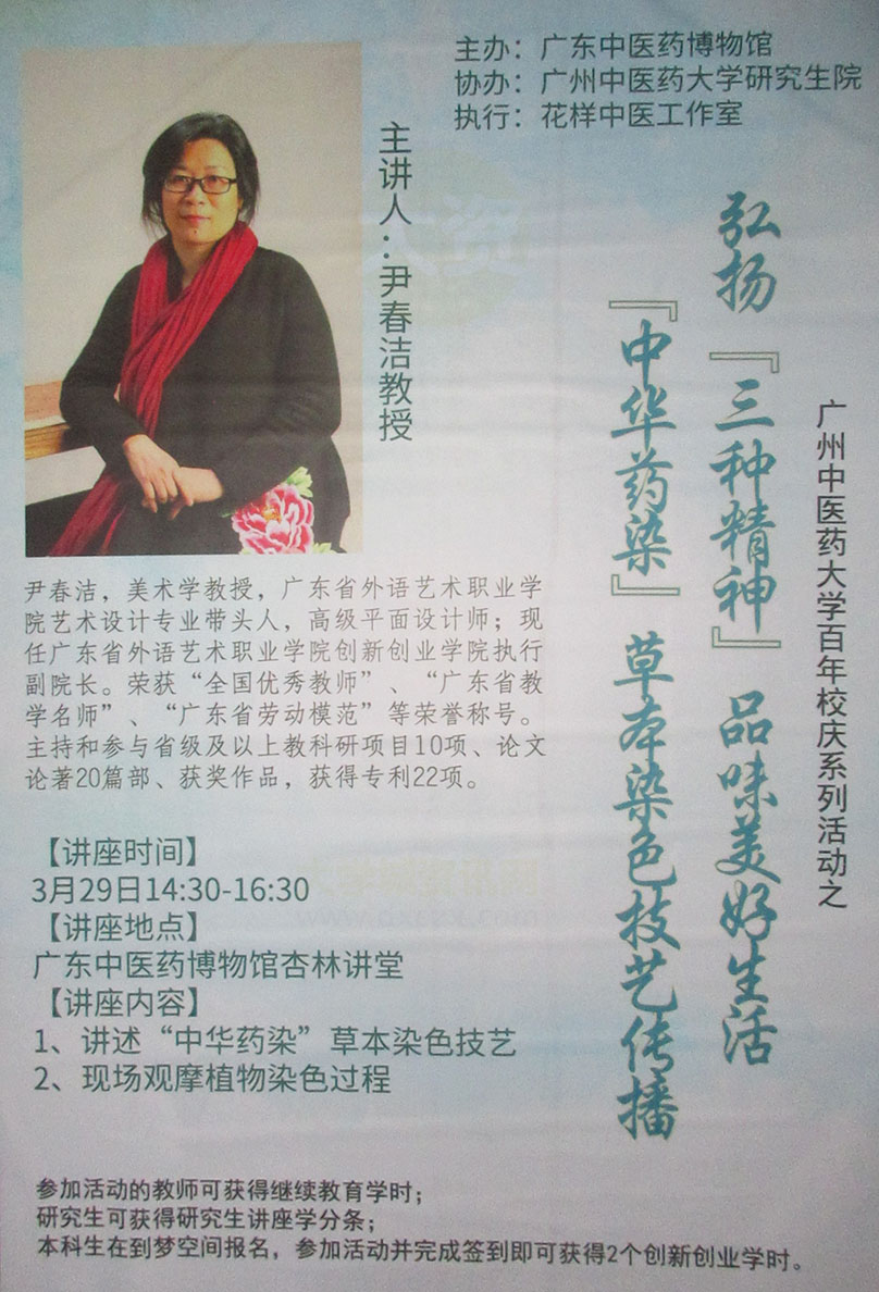 广中医-百年校庆系列活动之弘扬三种精神,品味美好生活 中华药染-草本染色技艺传播-讲座预告 3月29日下午14点30-16点30 中医药博物馆杏林讲堂 主讲-尹春杰教授 |