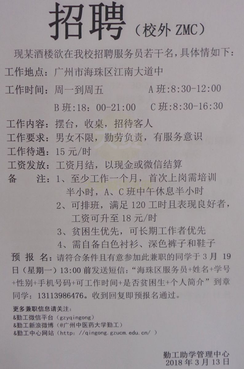 [招聘]|(校外ZMC)现某酒楼欲在我校招聘服务员若干名 2018年3月13日 | ||||||