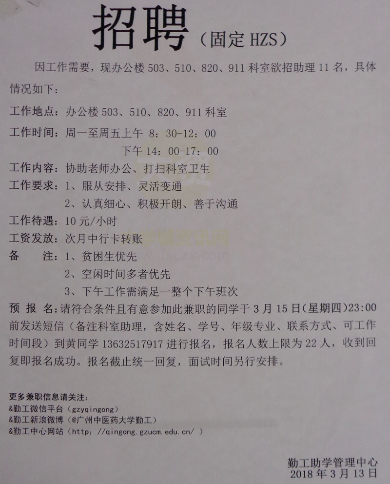 [招聘] | (固定HZS) 因工作需要,现办公楼503、510、820、911科室欲招助理11名 | ||||||