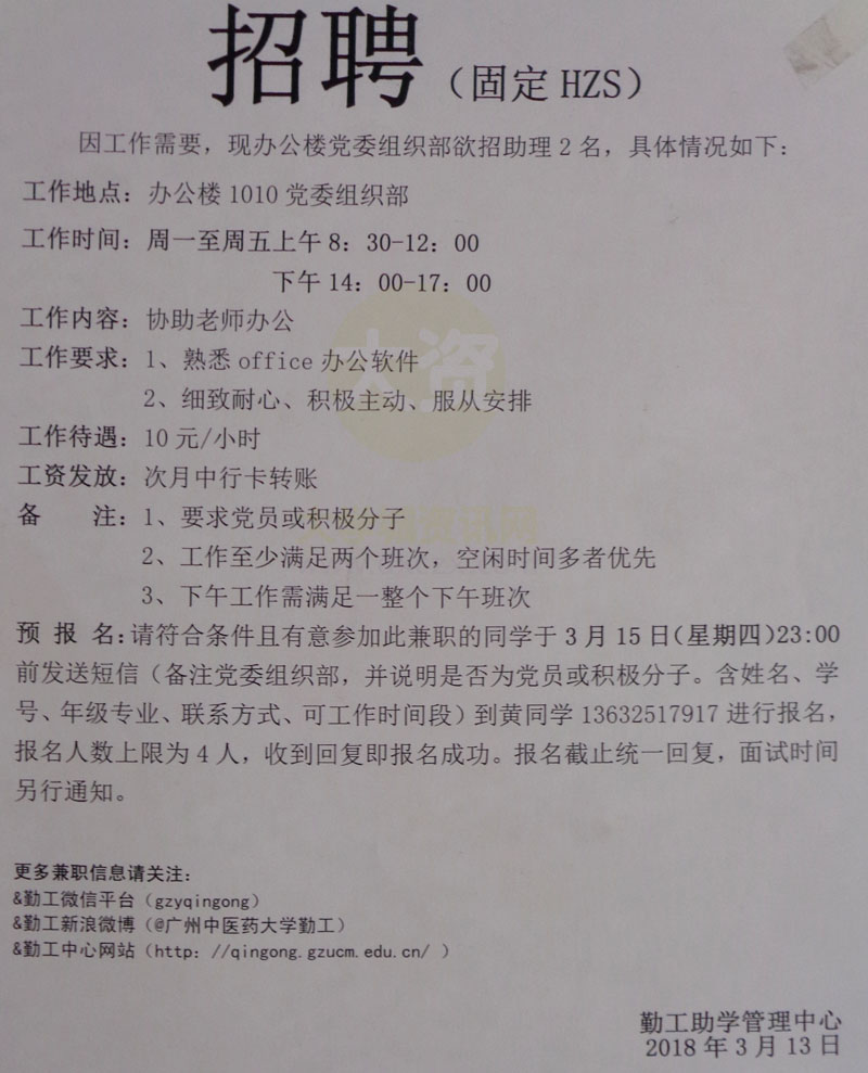 [招聘] | (固定 HZS)因工作需要,现办公楼党委组织部欲招助理2名 2018年3月13日 | ||||||