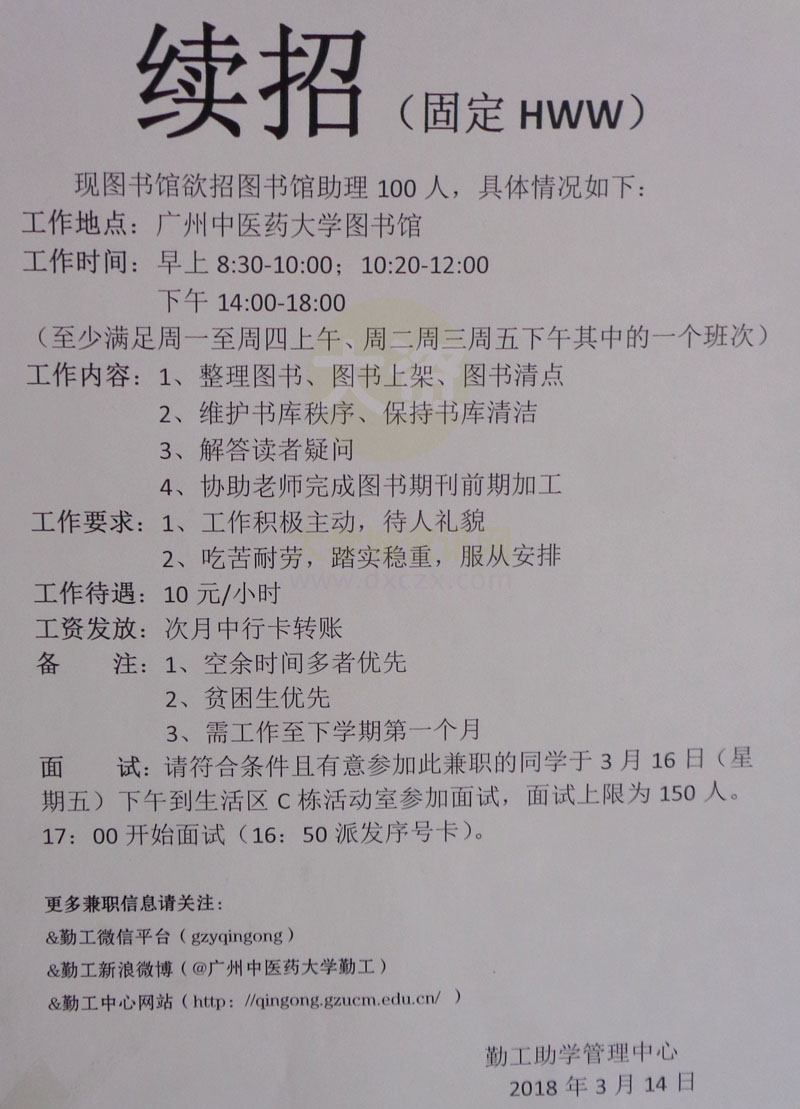 [续招] | (固定 HWW) 现图书馆欲招图书馆助理100人 2018年3月14日 | ||||||