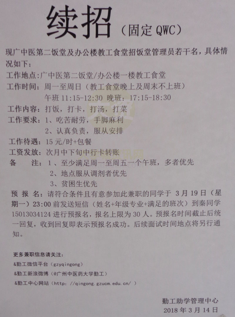 [续招] | (固定 QWC) 现广中医第二饭堂及办公楼教工食堂招饭堂管理员若干名 2018年3月14日 | ||||||