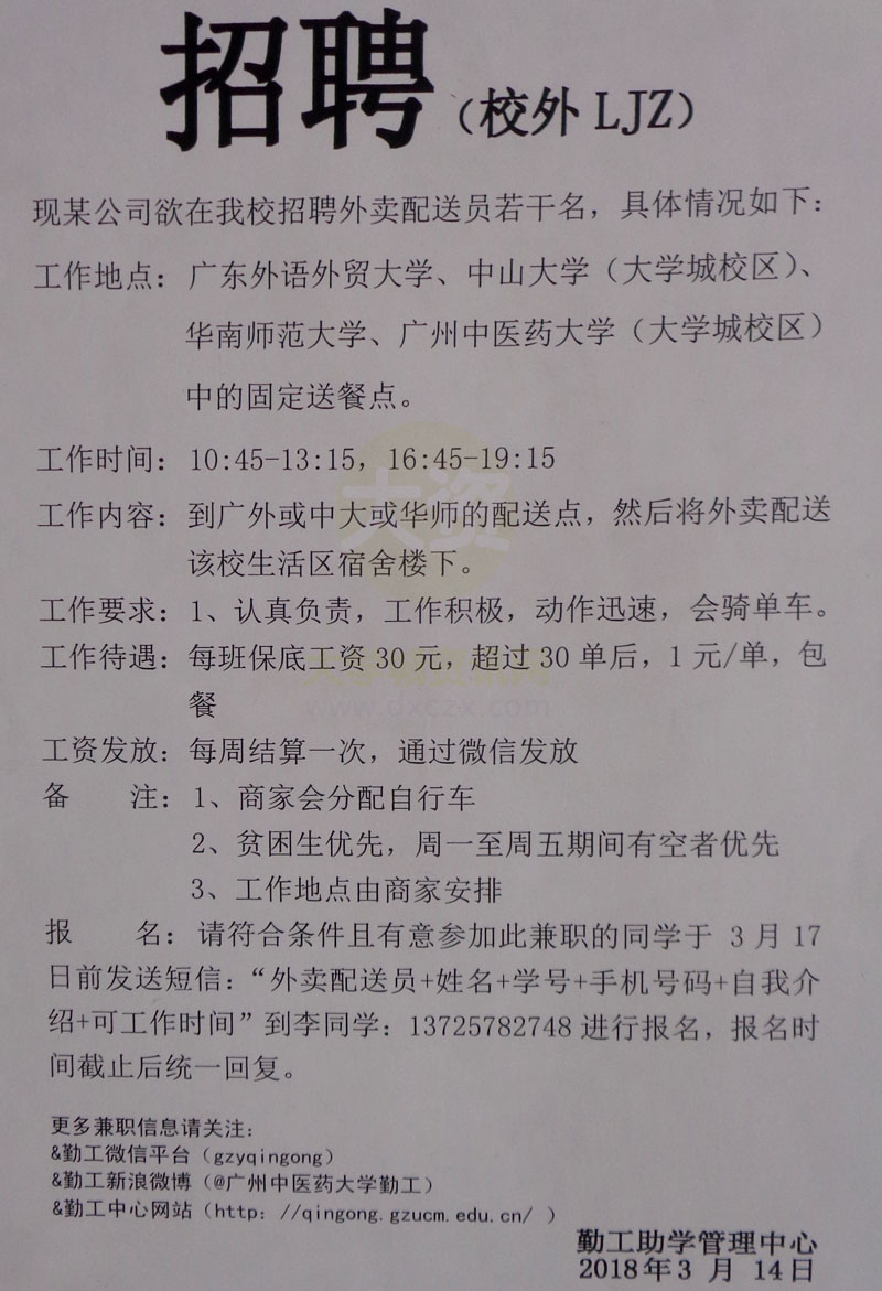 [招聘] | (校外 LJZ) 现某公司欲在我校招聘外卖配送员若干名 2018年3月14日 | ||||||