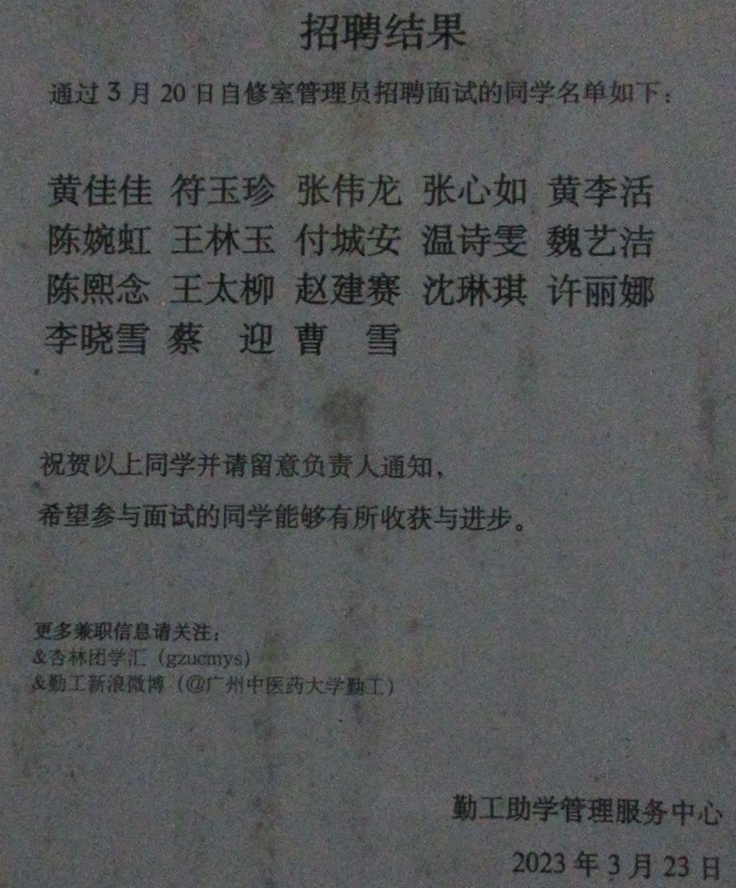 招聘结果公示 通过3月20日自修室管理员招聘面试的学生名单 2023年3月23日 勤工助学管理服务中心 |