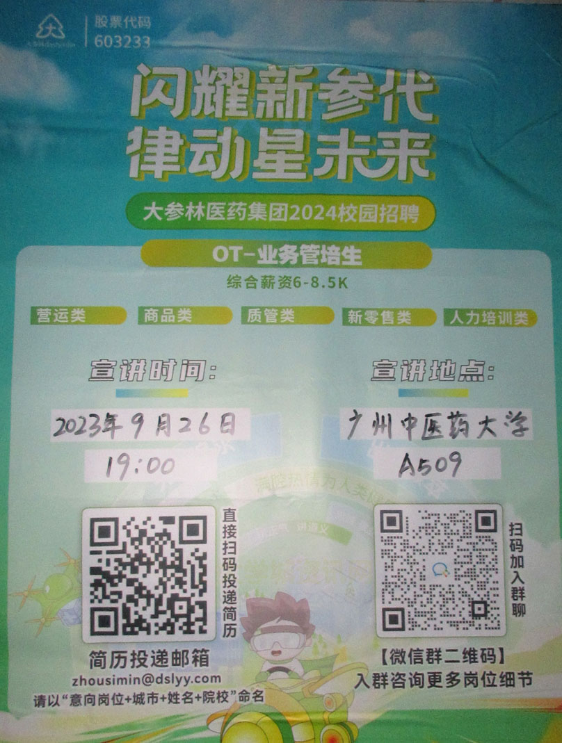 大参林医药集团2024校园招聘 宣讲时间2023年9月26日19点 广中医教学区A509 OT-业务管培生,综合薪资6-8.5K
