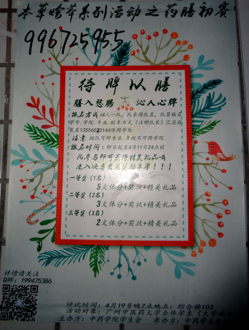 本草荟萃系列活动之药膳初赛 评比时间4月19号晚7点 地点:综合楼102 | ||||||