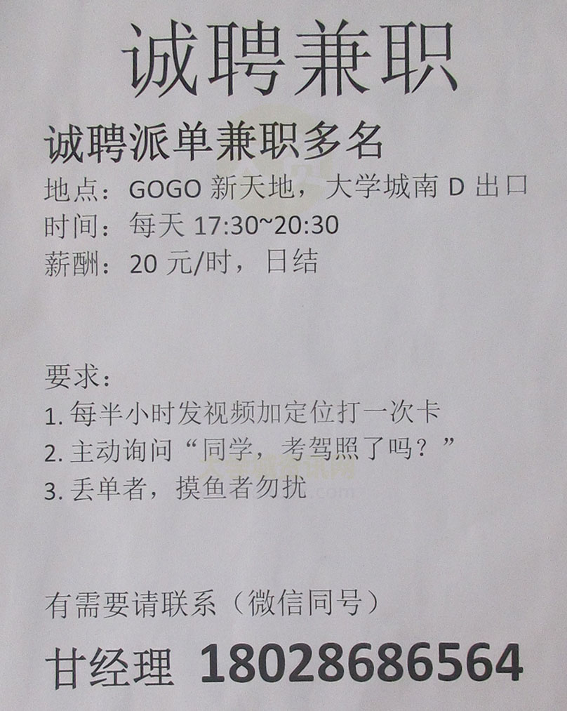 诚聘派单兼职多名 派发地点:大学城内新天地及城南地铁D出口 薪酬20元1小时