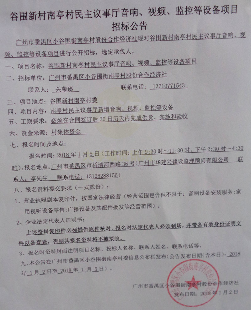 谷围新村南亭村民主议事厅音响、视频、监控等设备项目招标公告 | ||||||