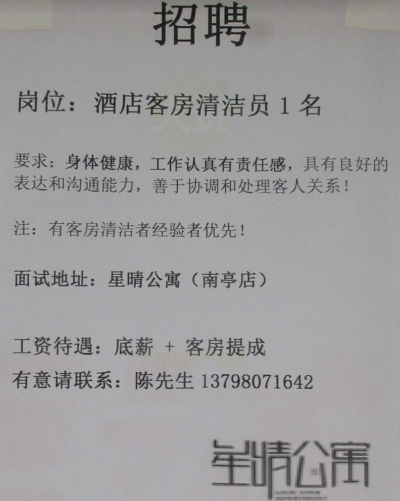 星晴公寓南亭店招聘酒店客房清洁员1名 薪资待遇-底薪+客房提成 联系13798071642陈生 |