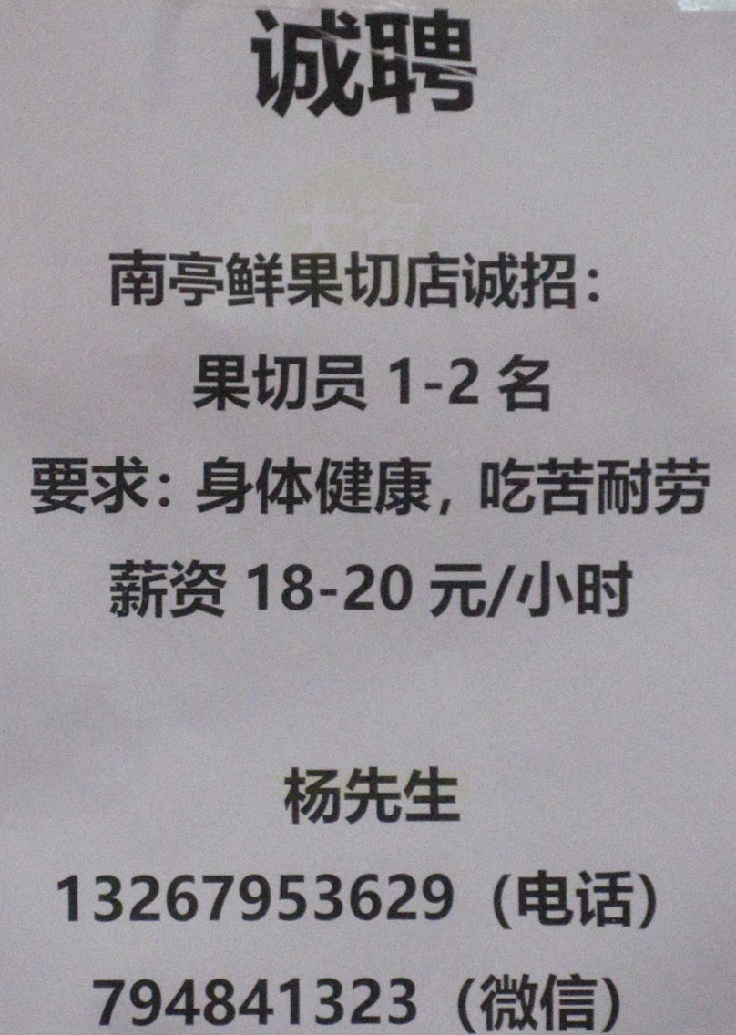 南亭鲜果切店诚聘果切员1-2名 薪资18-20元1小时 杨生13267953629 |