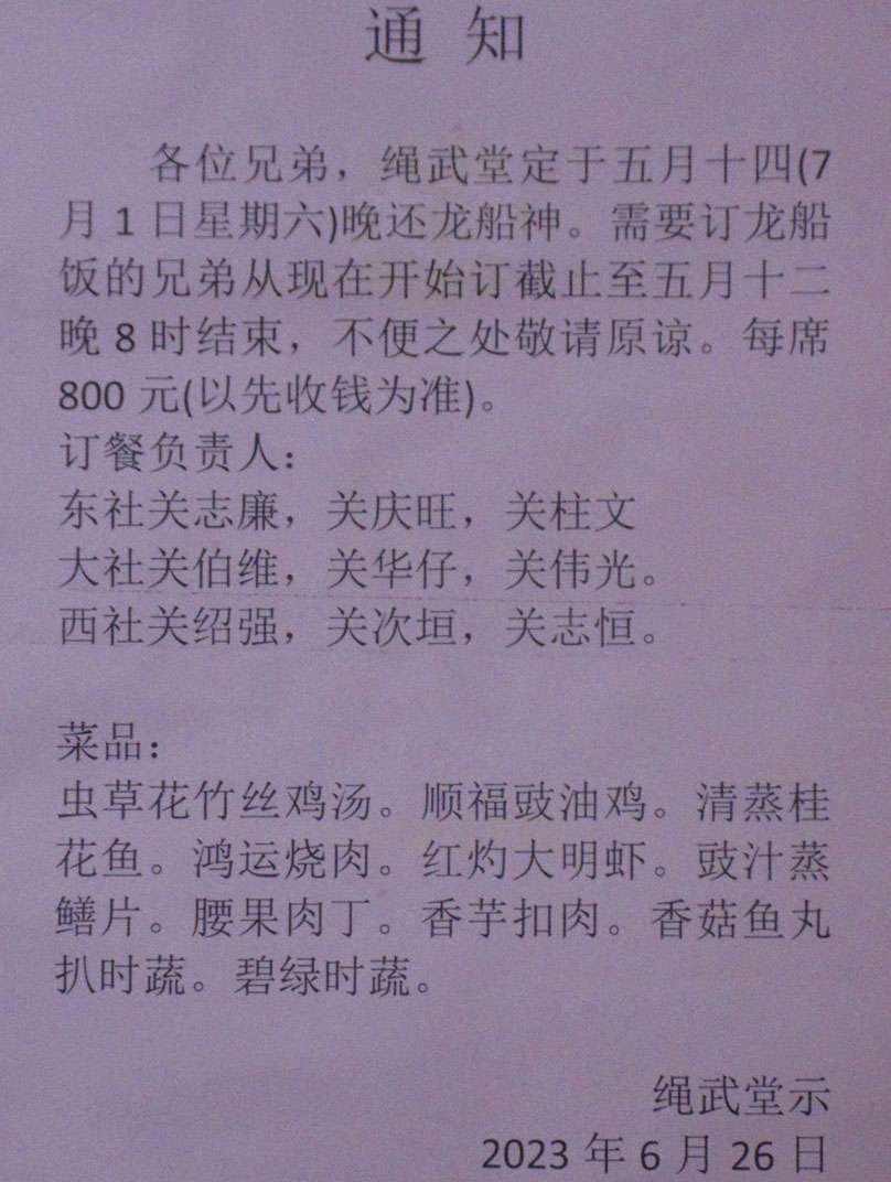 南亭村·绳武堂 还龙船神预订龙船饭通知 饭时7月1号(五月十四)晚 预订截止6月29号晚8点 | ||||||