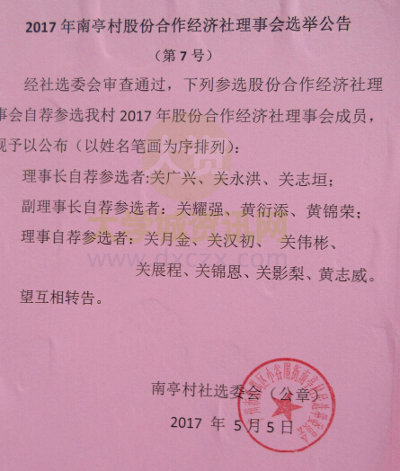 2017年南亭村股份合作经济社理事会选举公告(第7号) | ||||||