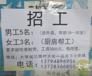 贝岗一品天下小吃城招工男5名送外卖女3名厨房帮工