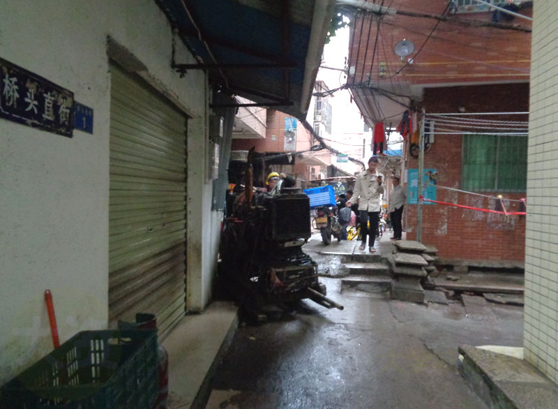 桥头直街桥头处段有打桩作业机正在推进深入某街巷内 | ||||||