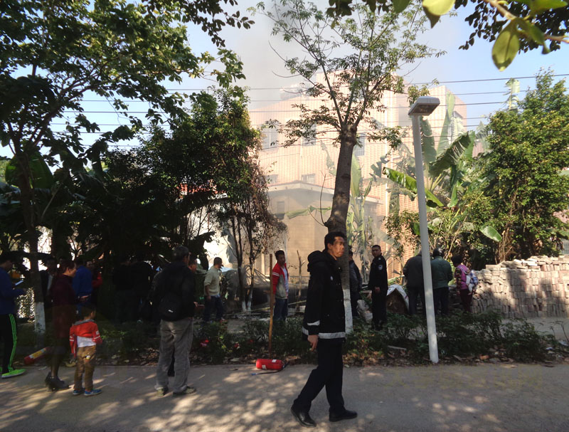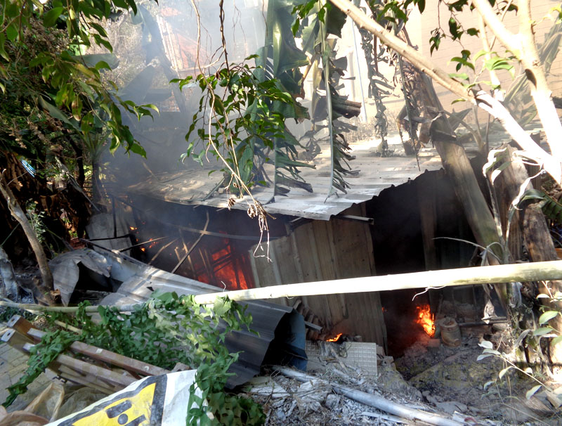 看到确实火还烧着,烟还挺浓,着火的是一个低矮的铁皮房,有可能是一个炉灶厨房。现场听到人说,本来刚刚火还挺小的,后来拿过来的灭火器似乎没及时作用,就现在烧大了,已经看到有人在拨打119火警电话了 |