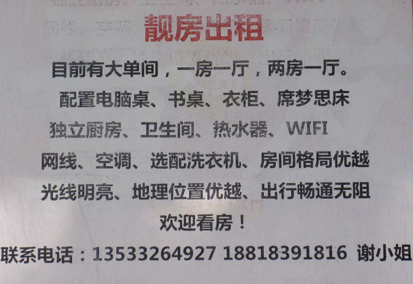 南亭·靓房出租 目前有大单间 一房一厅 两房一厅 配置电脑桌书桌衣柜席梦思床独立厨卫热水器WIFI空调洗衣机等 房间格局好 光线明亮 位置优越 出行方便 联系13533264927 |
