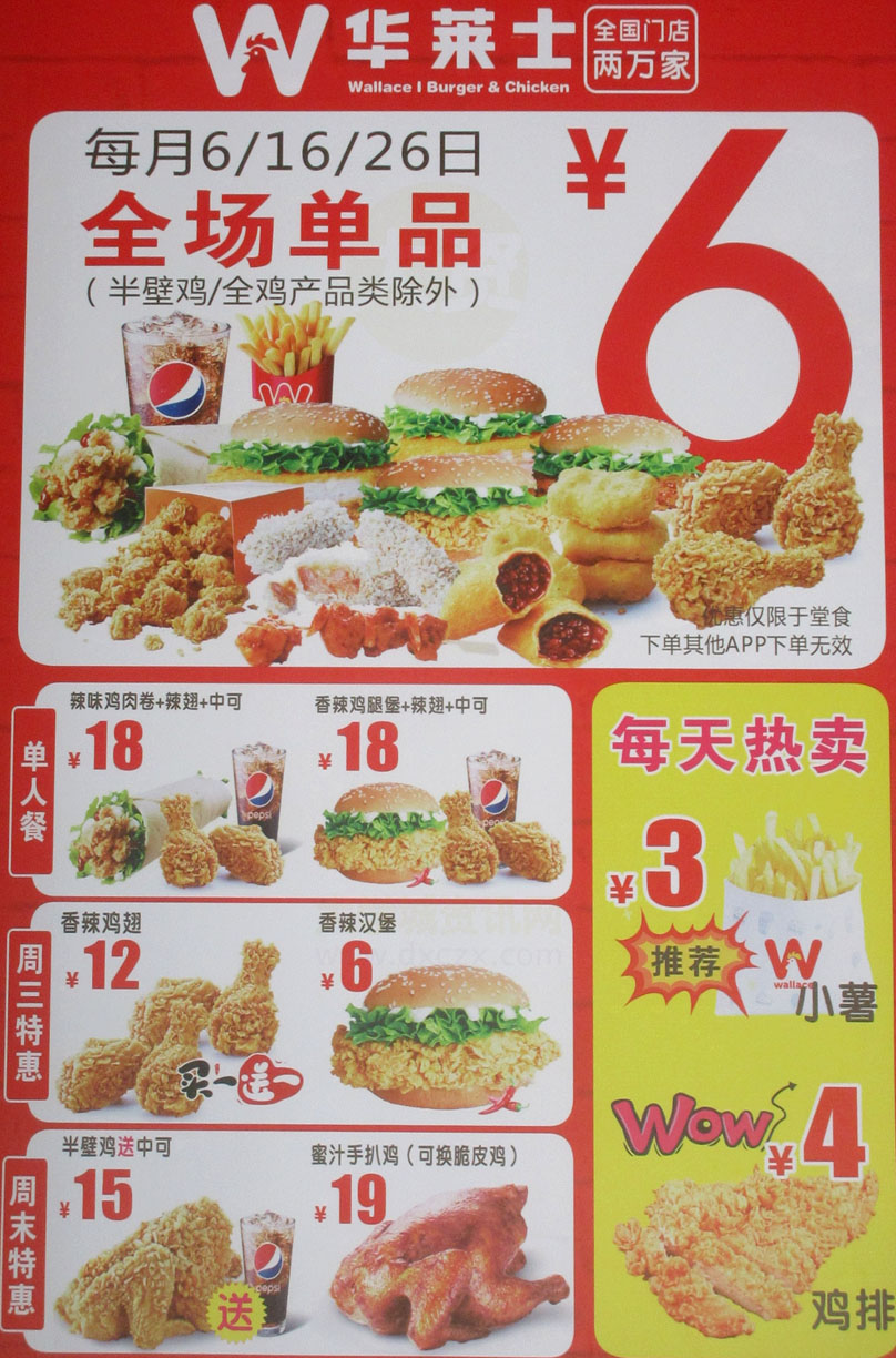 南亭村-下朗大街南端 华莱士每月6/16/26号全场单品仅需6元 半壁鸡/全鸡产品类除外 同时是仅限于堂食 | ||||||