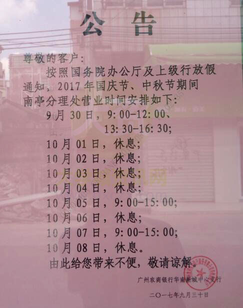 农商行国庆、中秋期间南亭分理处营业时间安排 | ||||||