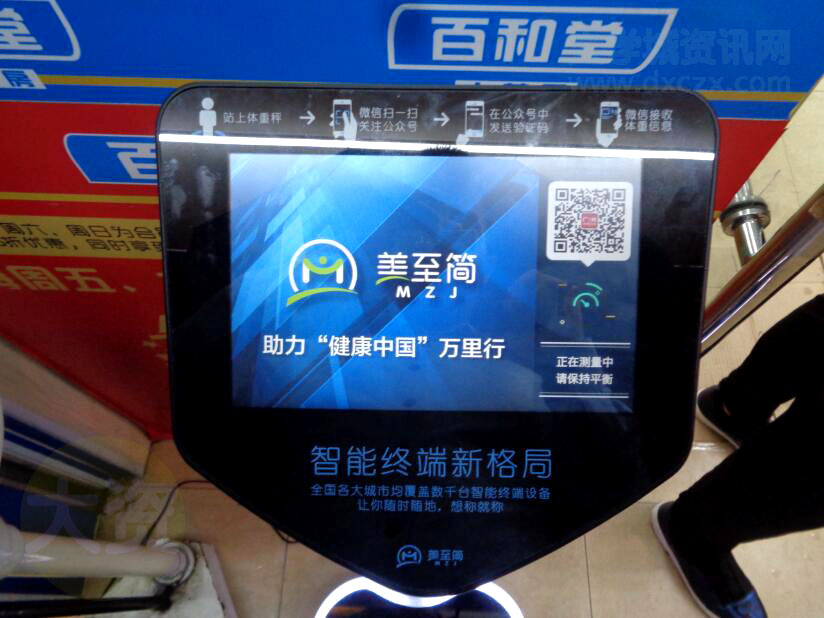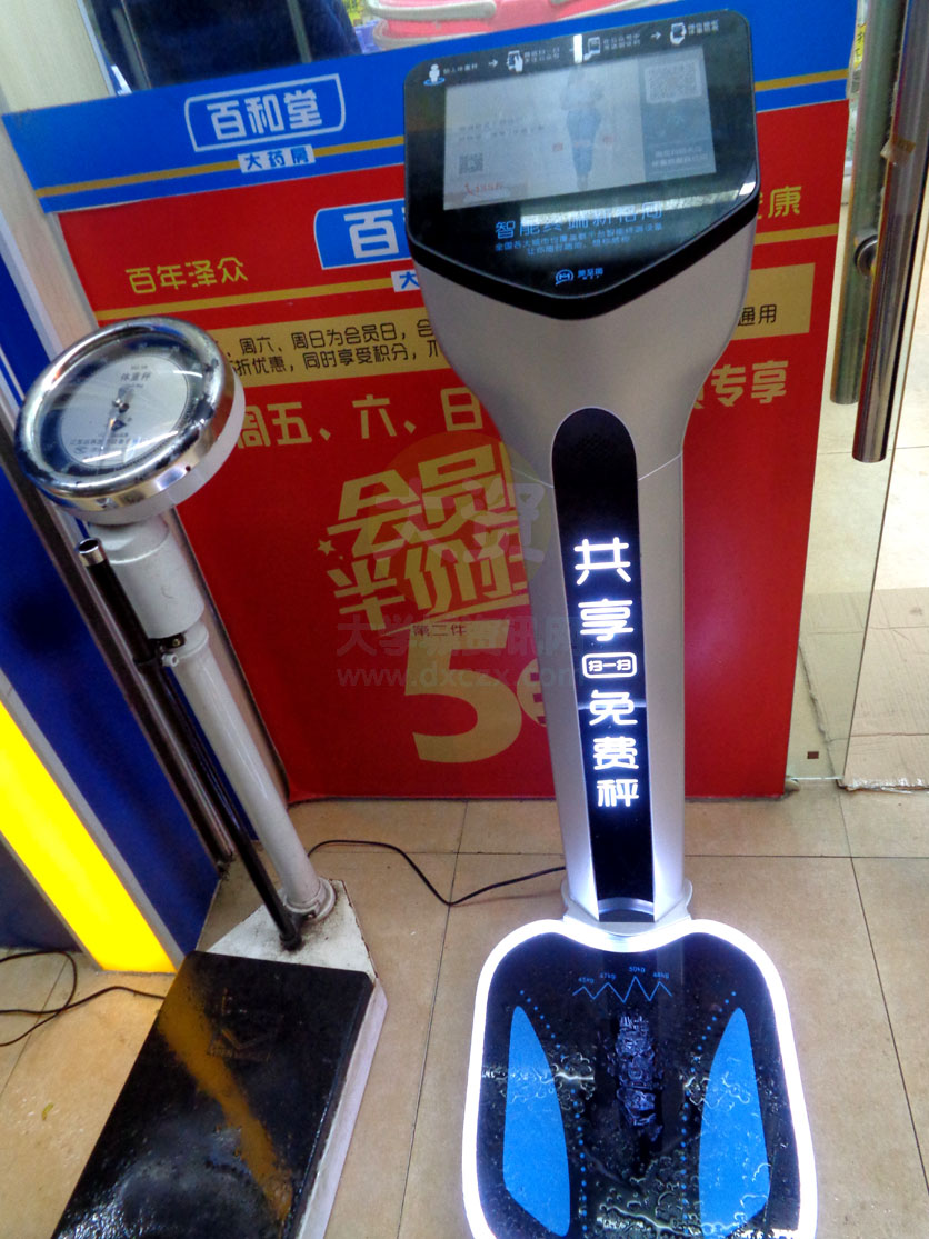 百合堂药店前近日多摆放了一台共享免费秤 似乎又是扫码公众号关注的套路啊,人家也是宣传啊,说是免费,还是要你扫码关注公众号滴