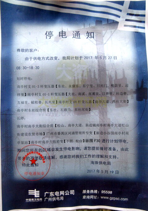 南亭村停电通知2017年5月27日08:30-18:30 | ||||||