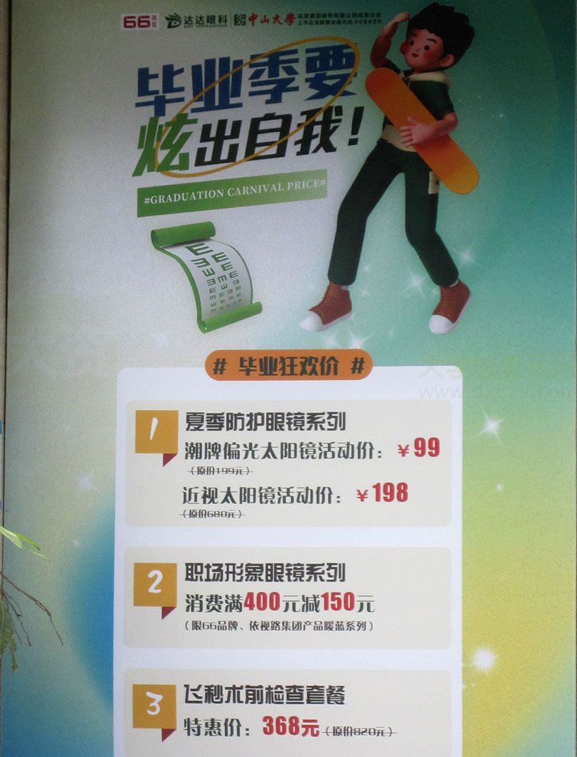 南亭村大街北段中 66明镜 毕业季优惠特价 潮牌偏光太阳镜99元 近视太阳镜198元 职场形象眼镜消费满400减150 飞秒术前检查套餐特惠价368元 | ||||||