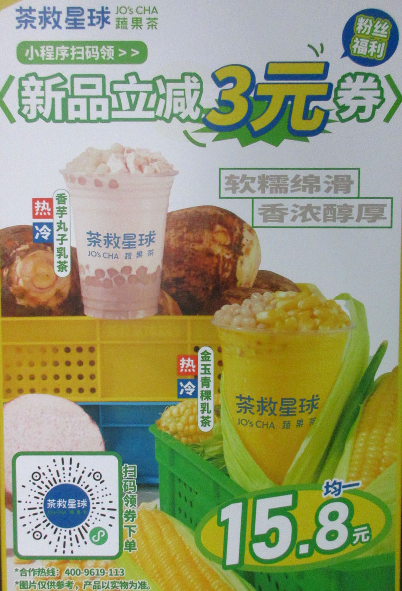 南商街十号楼东北角 茶救星球蔬果茶 小程序扫码领新品立减3元券;香芋丸子乳茶&金玉青稞乳茶均15.8元,冷热可选