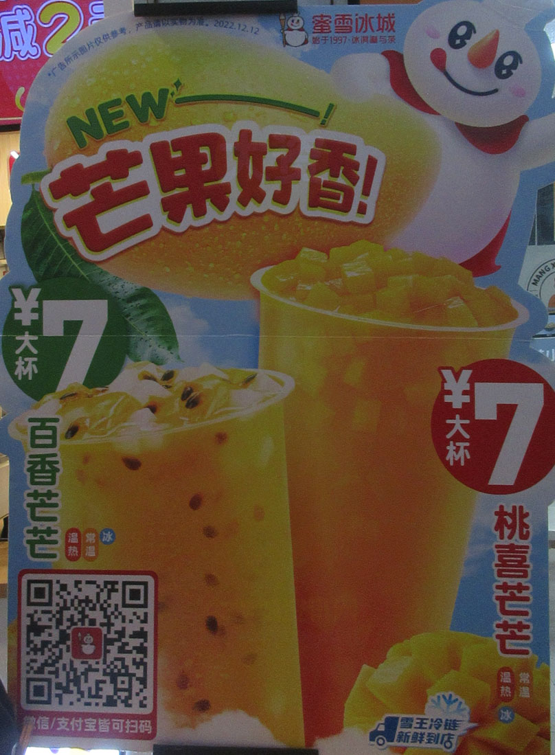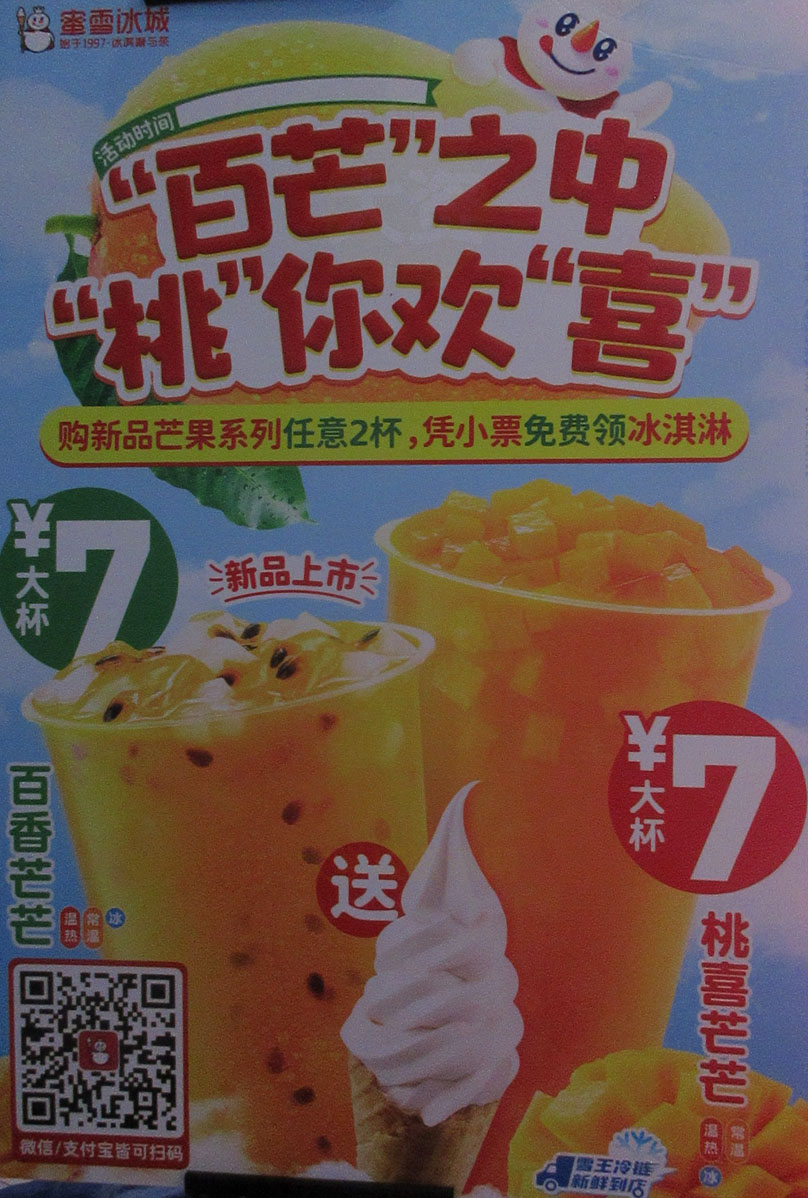 南商街十号楼东南角 蜜雪冰城 新品-百香芒芒&桃喜芒芒,均7元 购新品芒果系列任意2杯,免费送冰淇淋 | ||||||