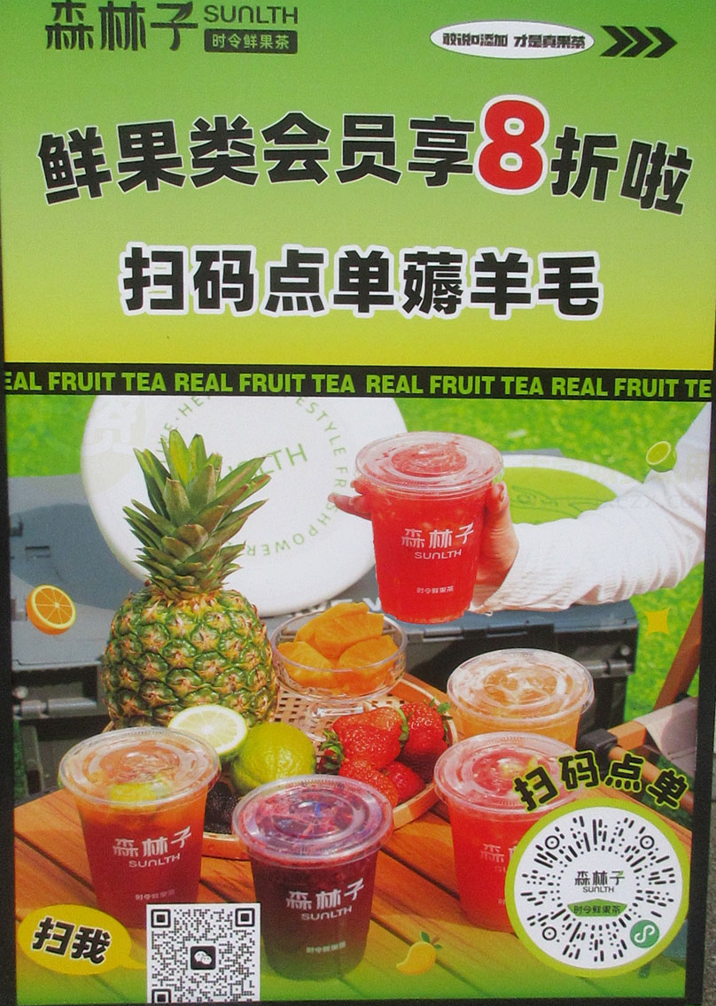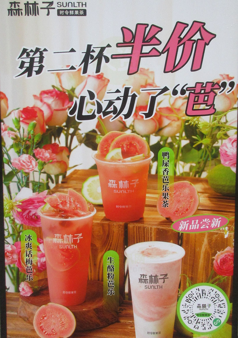 南商街八号楼东北角临街 森林子鲜果茶 鲜果类会员扫码点单享8折 芭乐系列新品尝鲜,第二杯半价