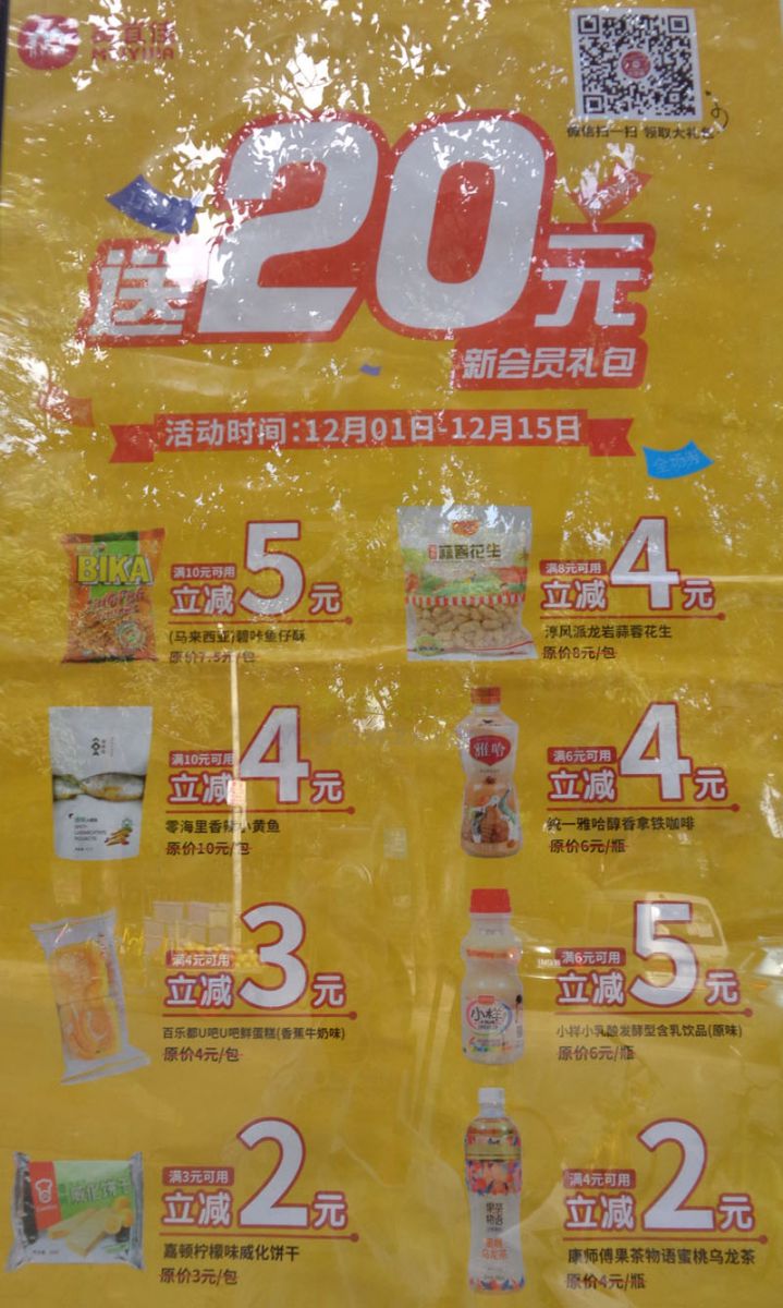 美宜佳小超市 送20元新会员礼包 活动时间:12月01日-12月15日 指定商品满减优惠 | ||||||