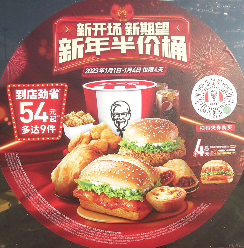 肯德基2023元旦新年半价桶 到店劲省54元起,多达9件 扫码凭券购买,仅限2023.01.01-01.04共4天,另+4.5元还可将新奥尔良烤鸡腿堡1个换购为新品-小龙虾烤鸡腿堡1个 | ||||||