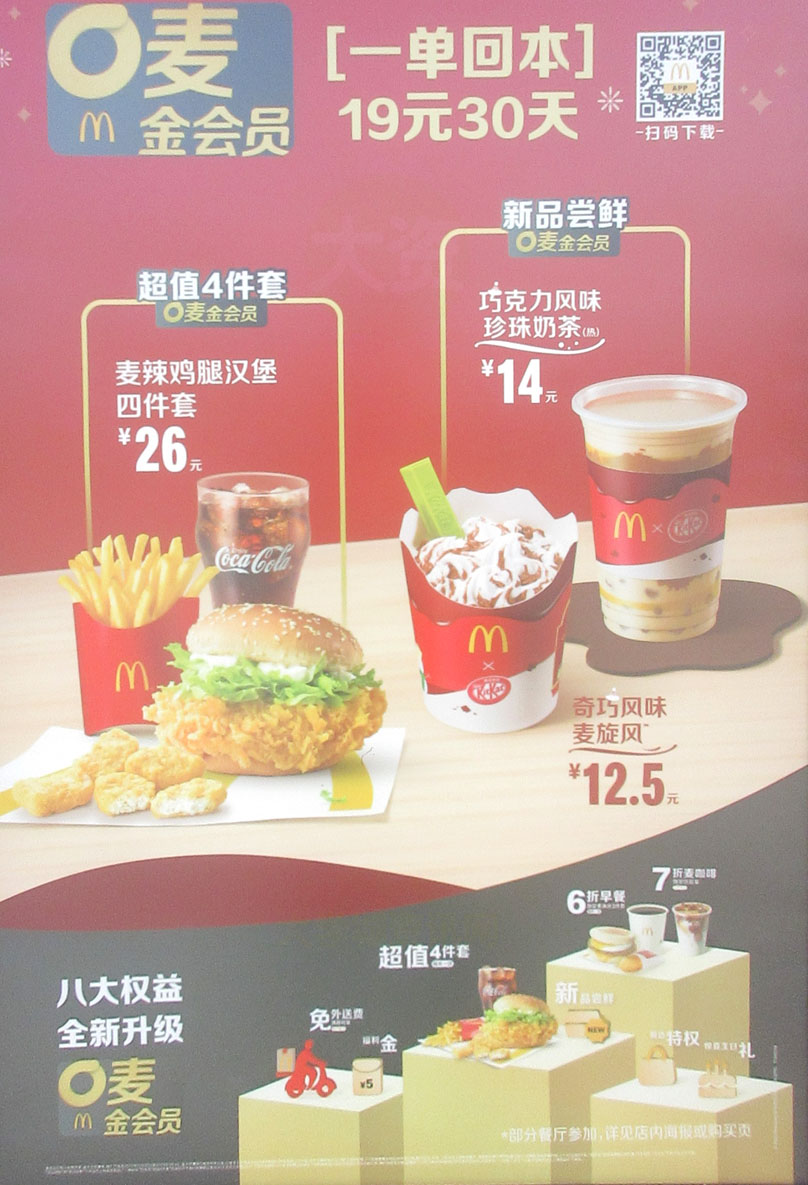 麦当劳O麦金会员19元30天 扫码下载 专享价:麦辣鸡腿汉堡超值四件套26元,新品尝鲜-巧克力风味珍珠奶茶14元,奇巧风味麦旋风12.5元 全新升级,八大权益详内见 | ||||||