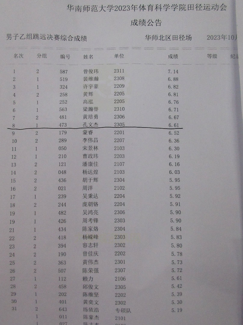 华师体育学院2023田径运动会10.29 男子乙组跳远决赛综合成绩
