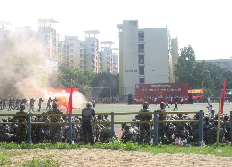 华南师范大学大学城校区2023级本科新生军训总结检阅汇演今上午在南生活区运动场进行 11个学院方阵行进参与了分列式 随后两个军训基本科目军体拳和匕首操展示以及一个反恐战术演练