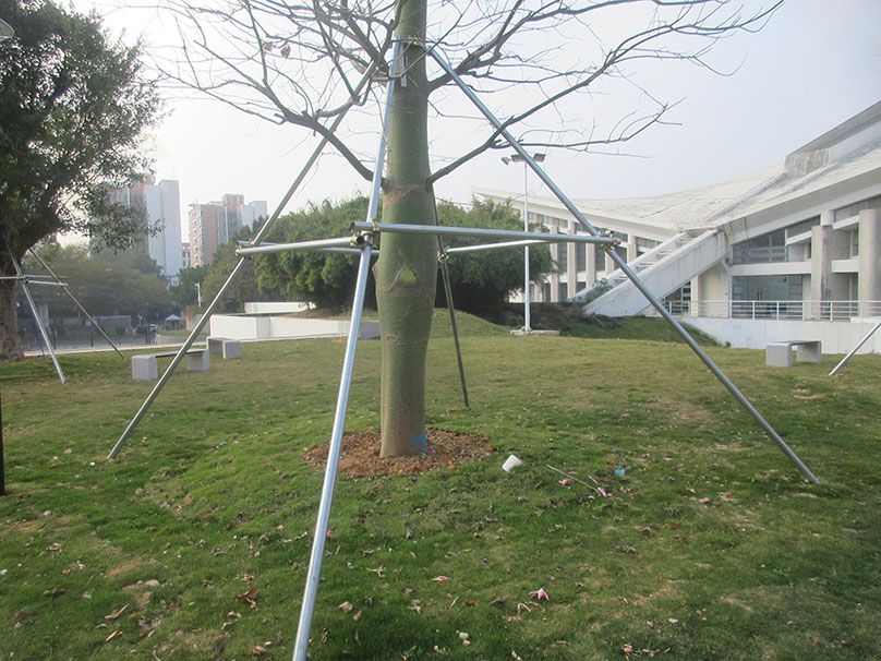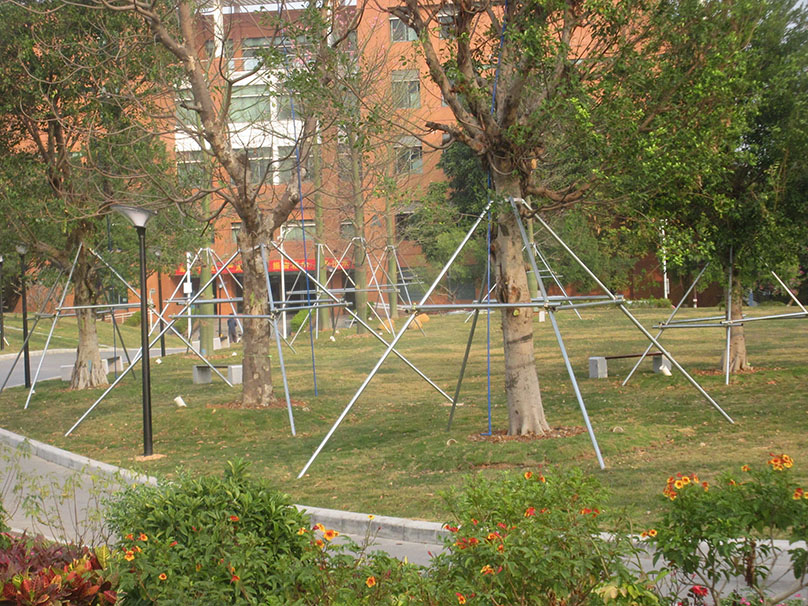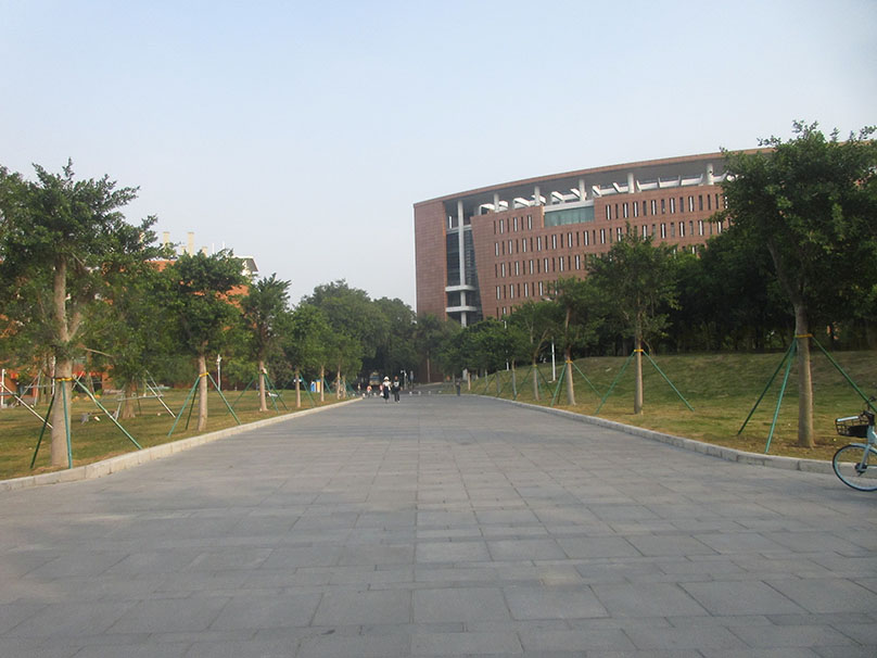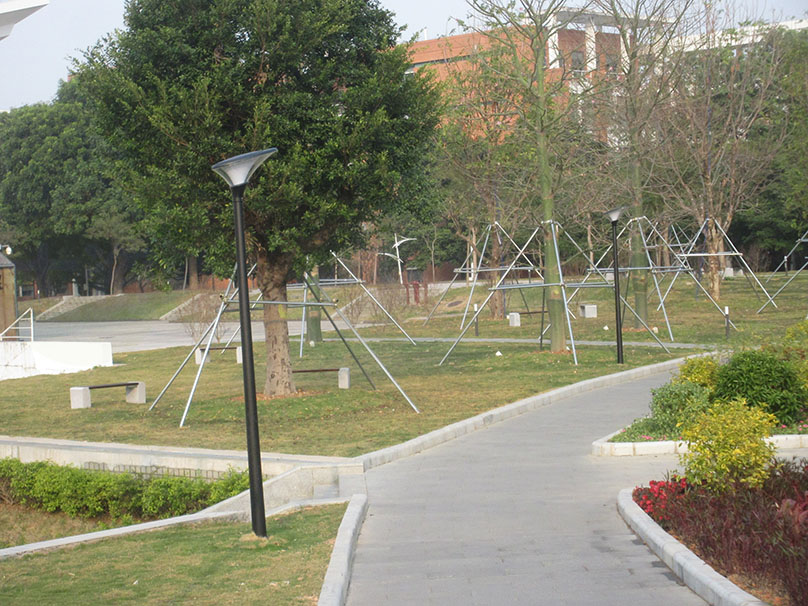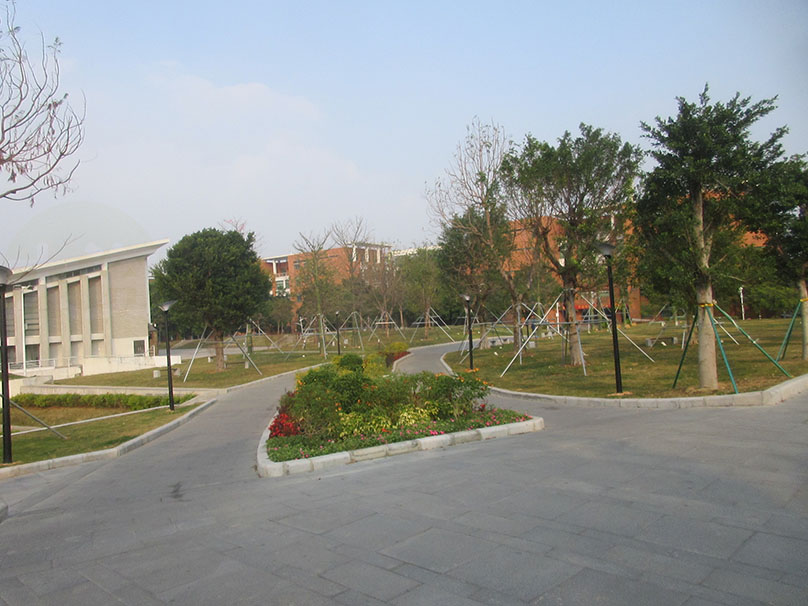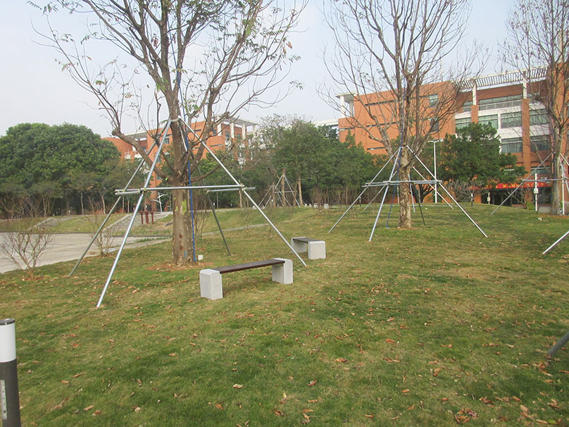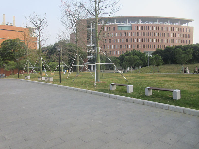 华工体育馆东南侧 新修草地步道 看到还装置了一些由石墩和木条组构的低矮板凳