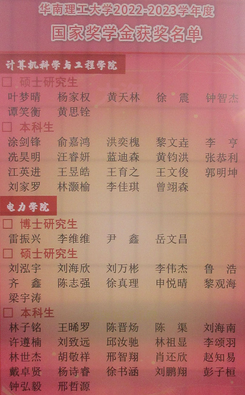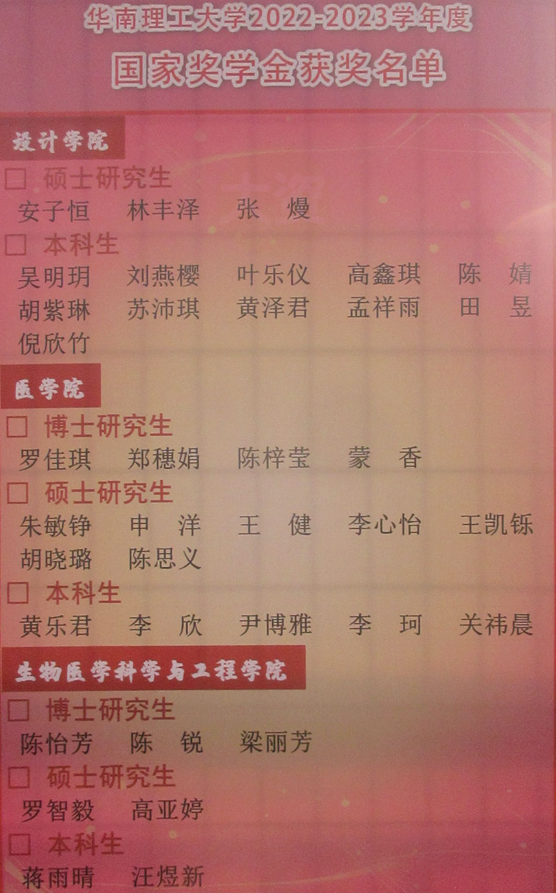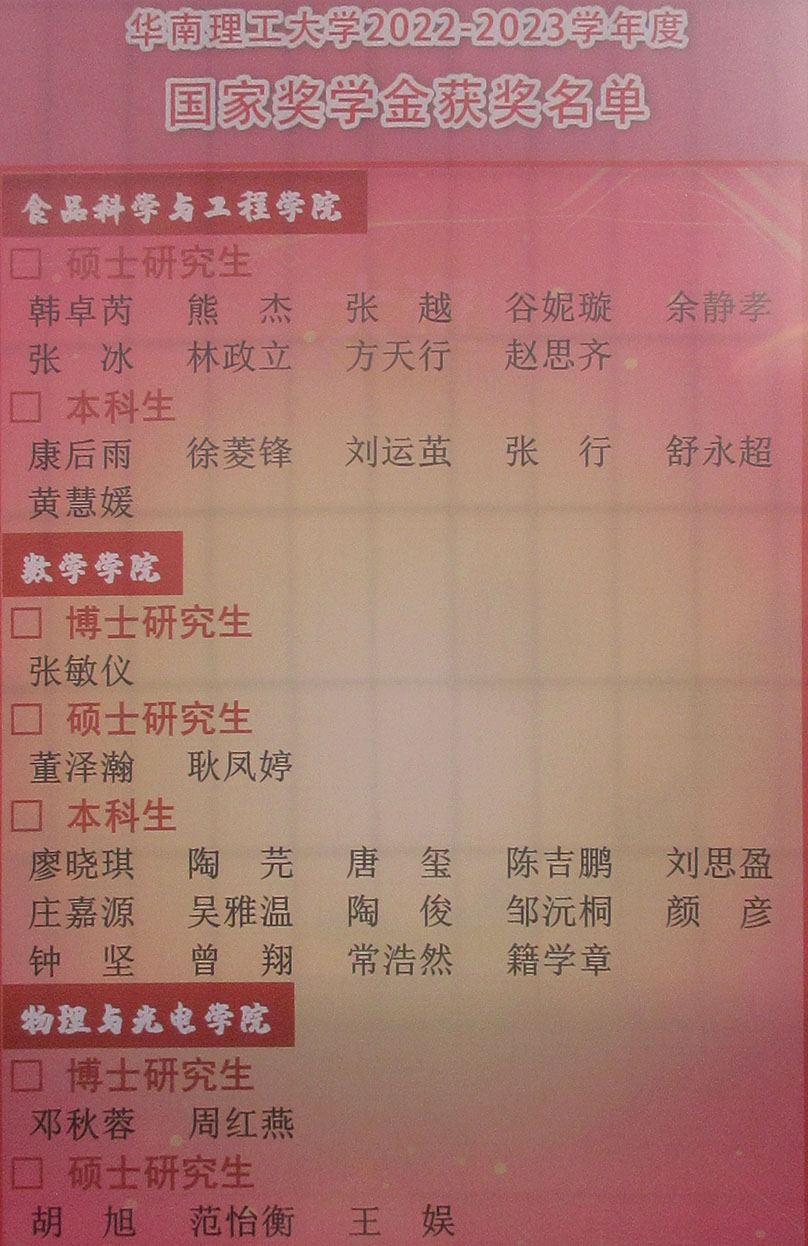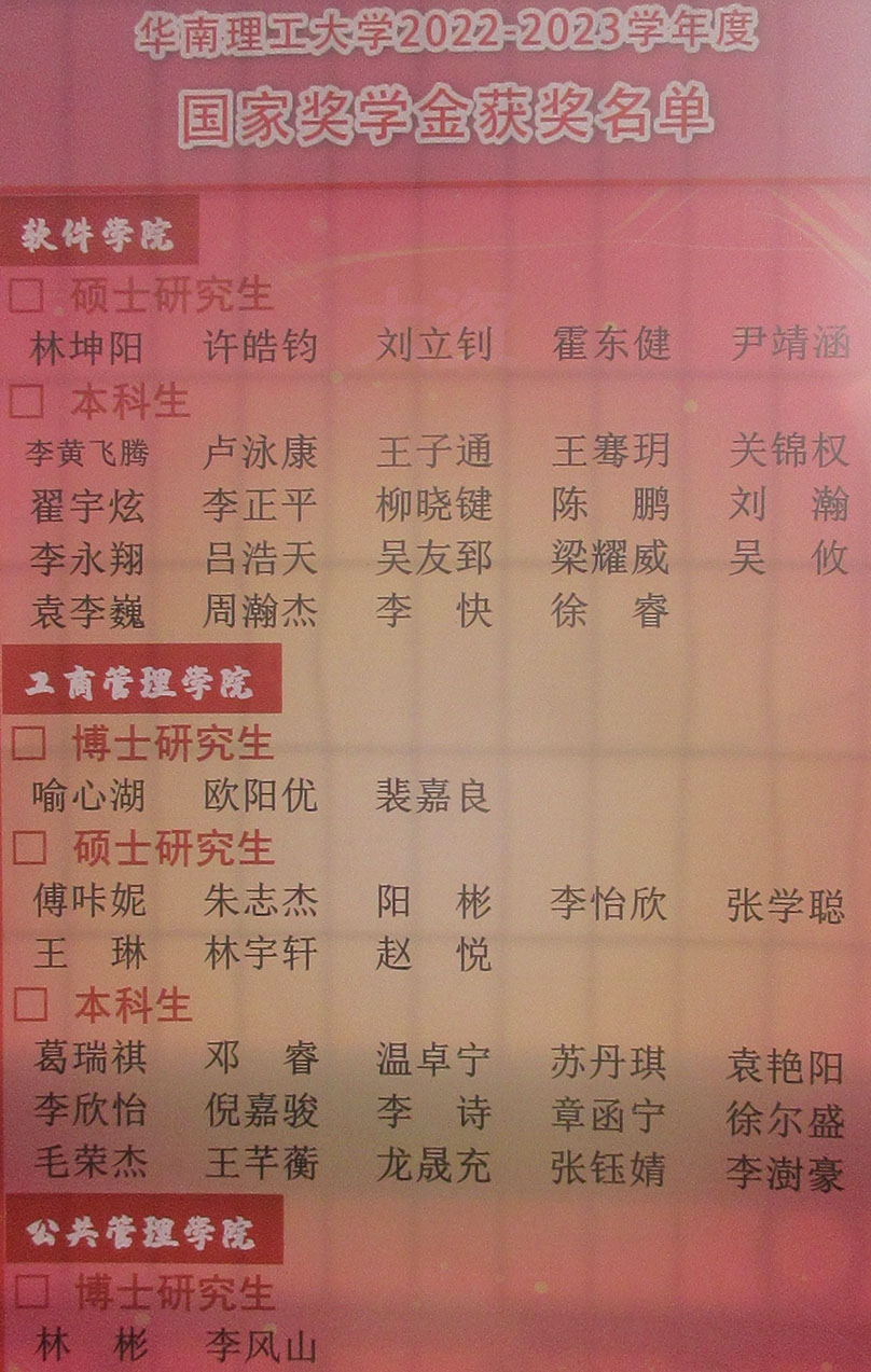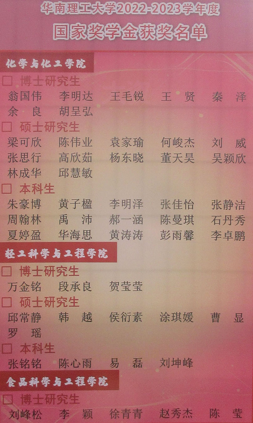 华南理工大学2022-2023学年度 国家奖学金获奖者