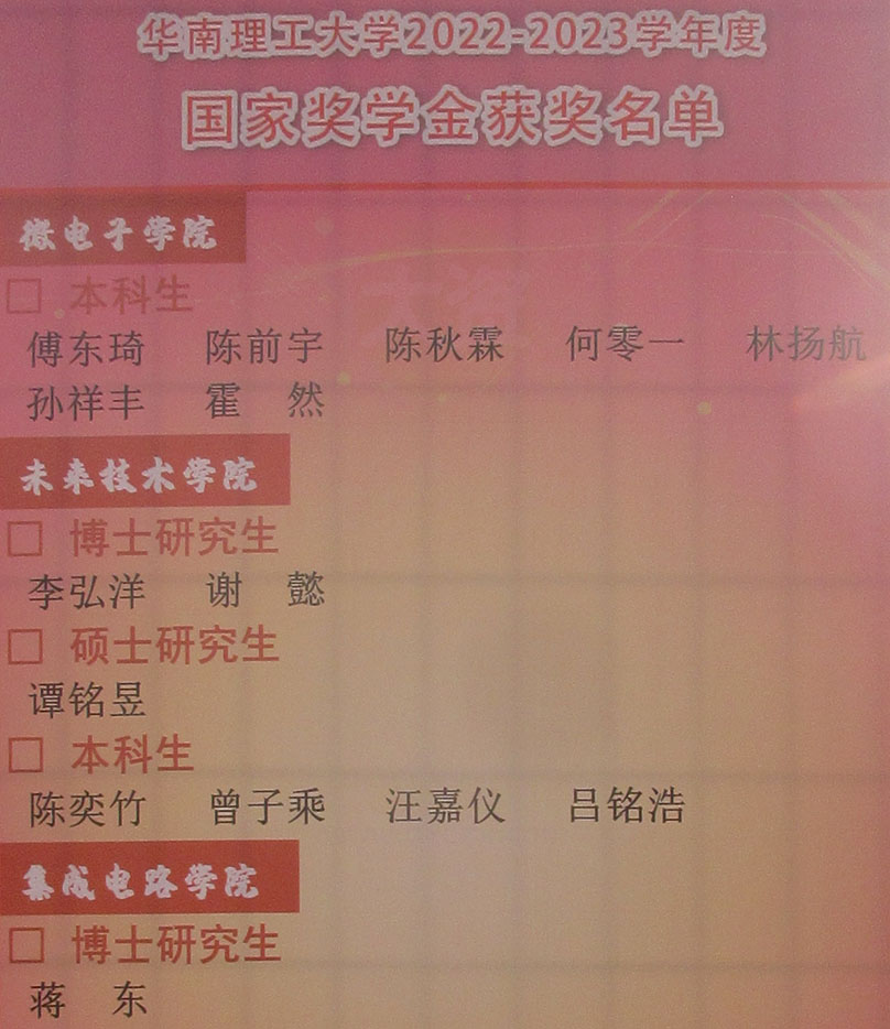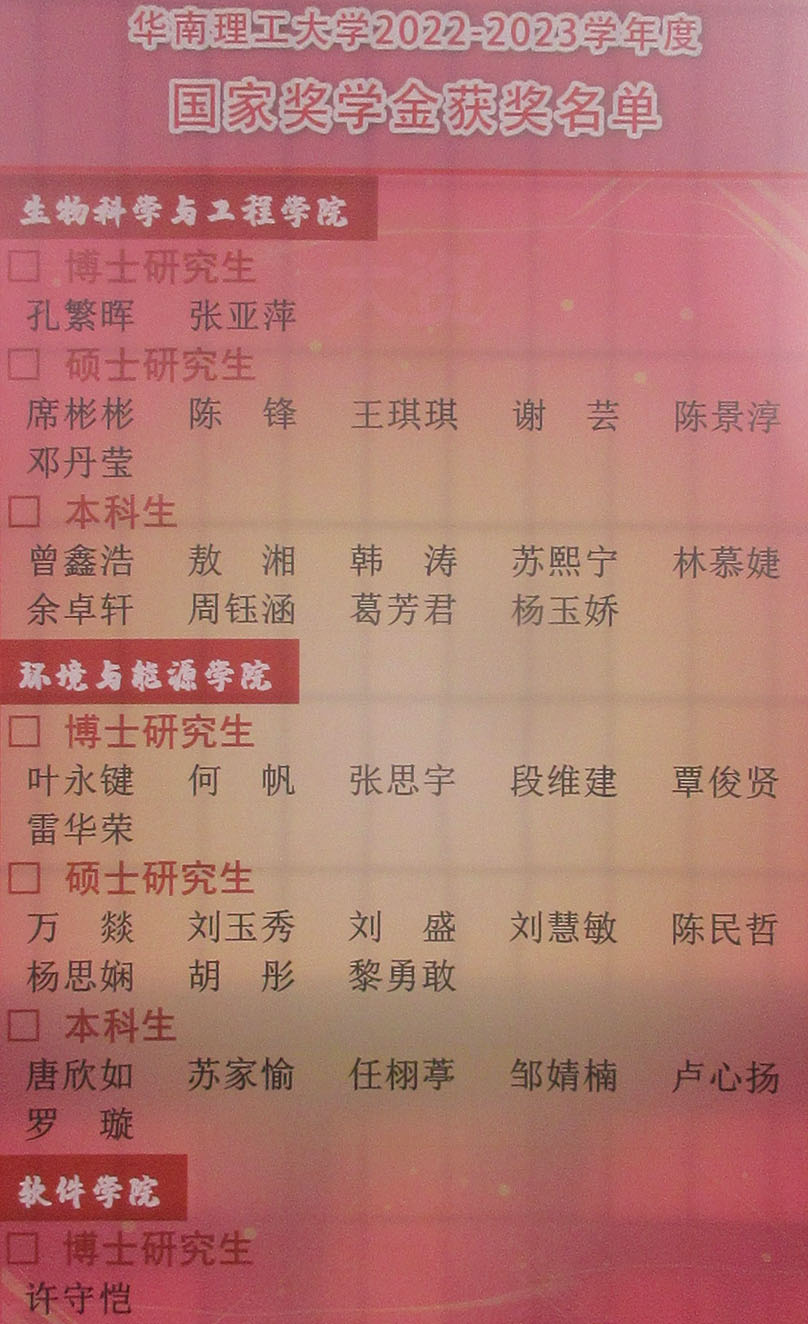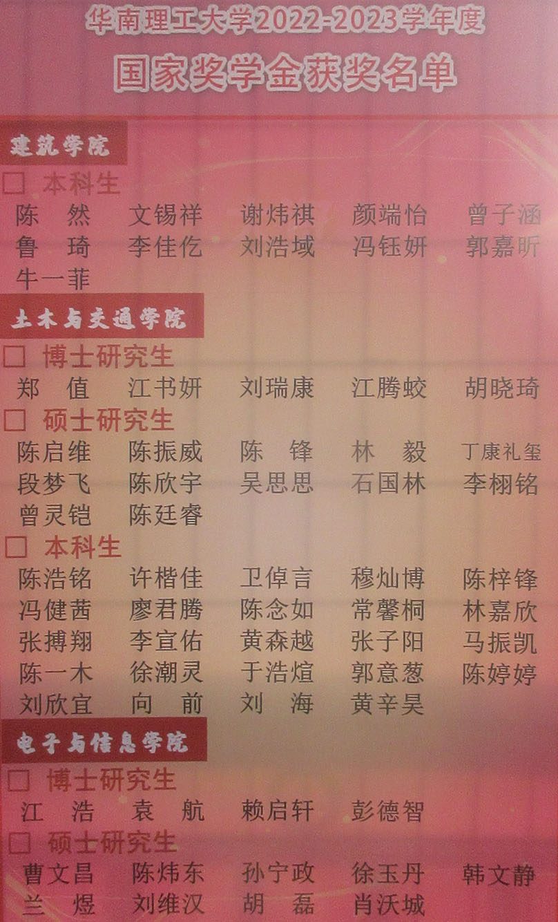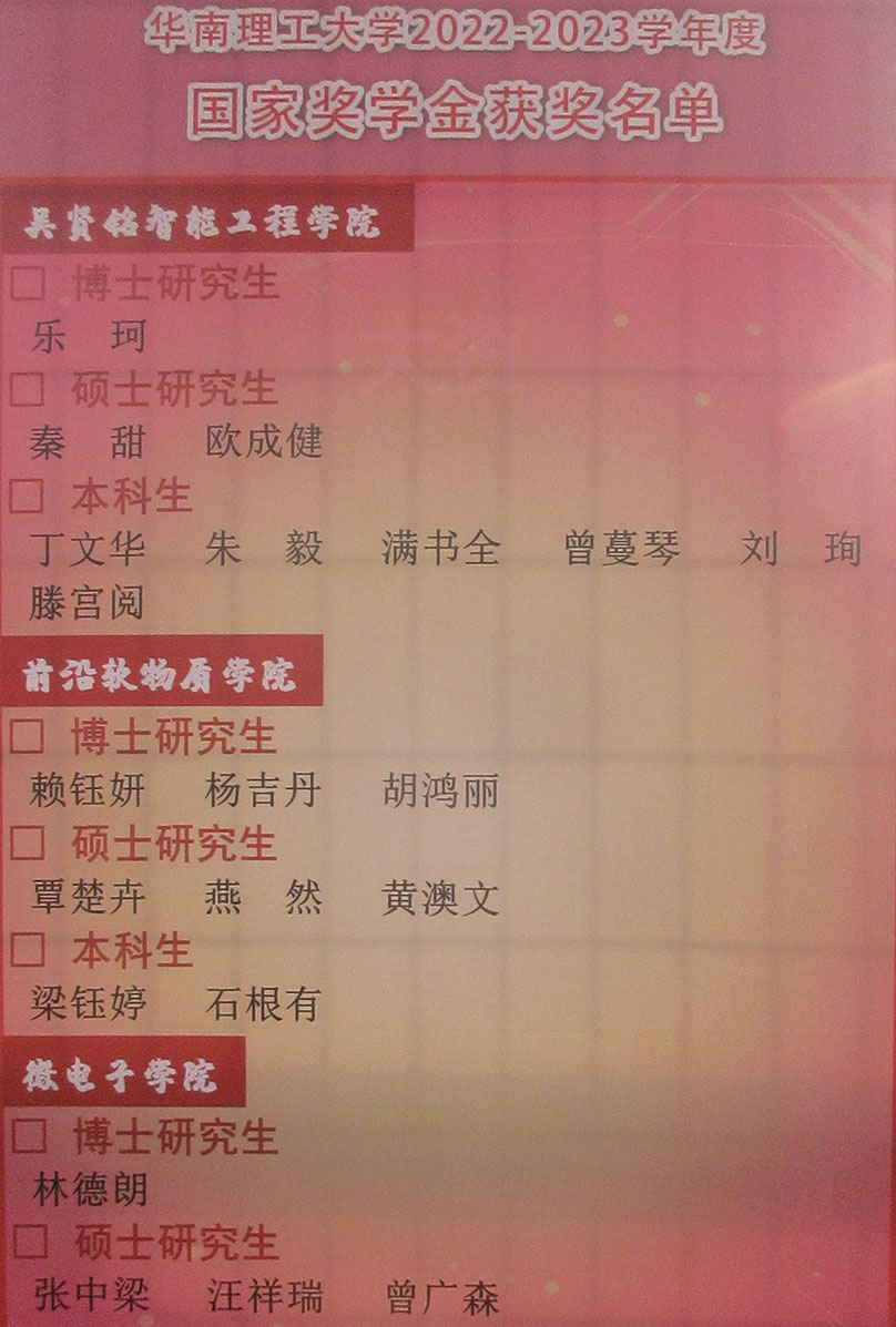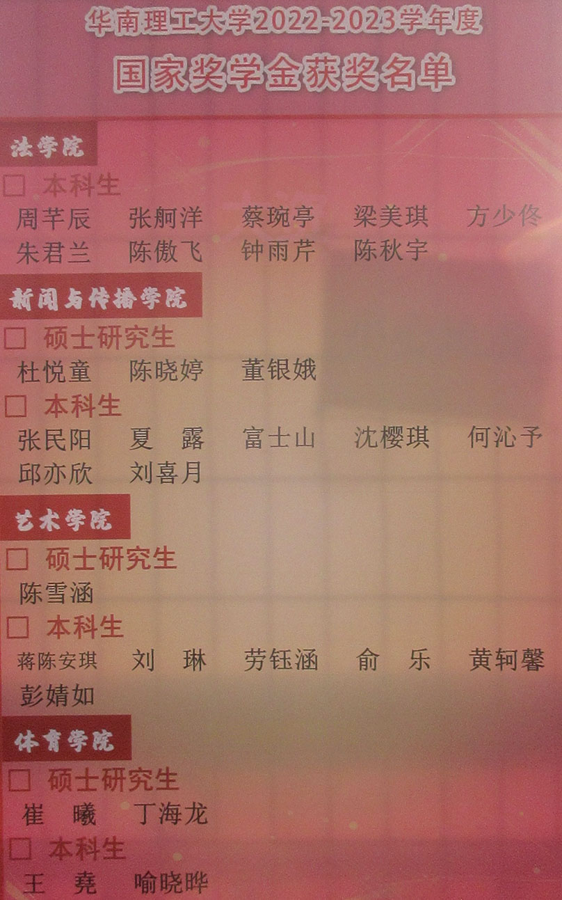 华南理工大学2022-2023学年度 国家奖学金获奖者