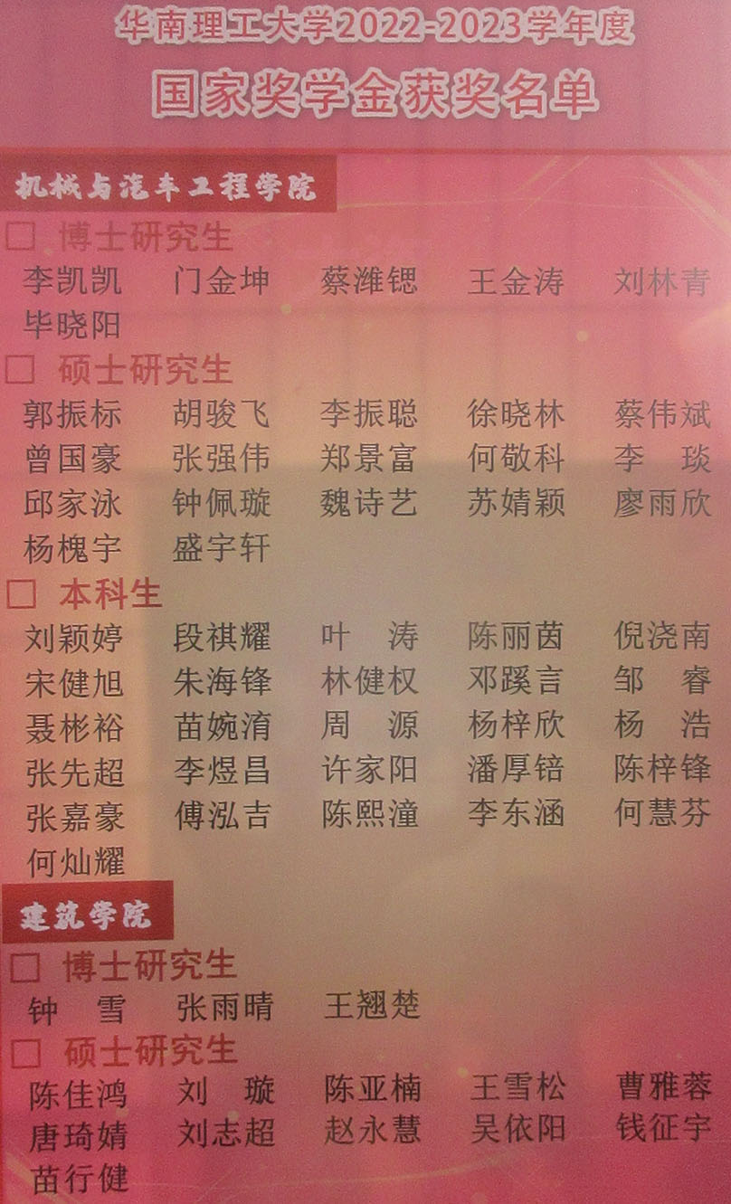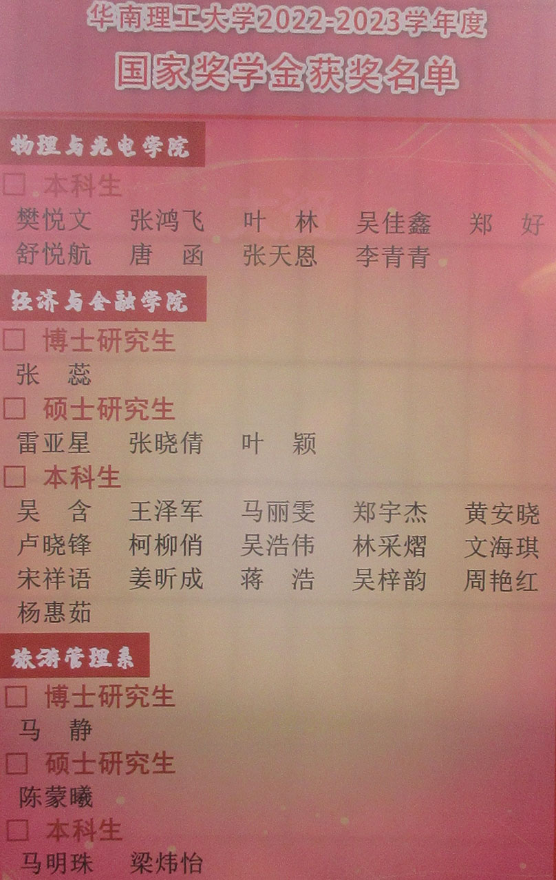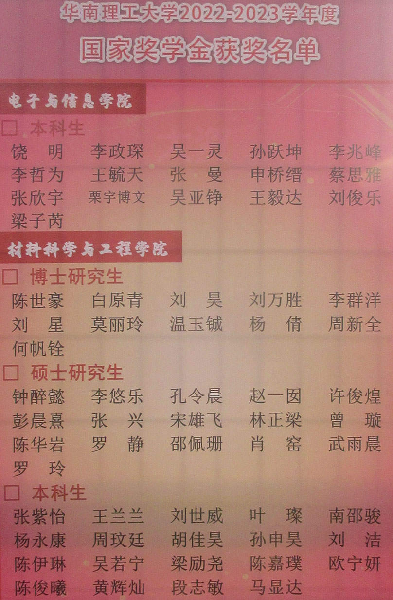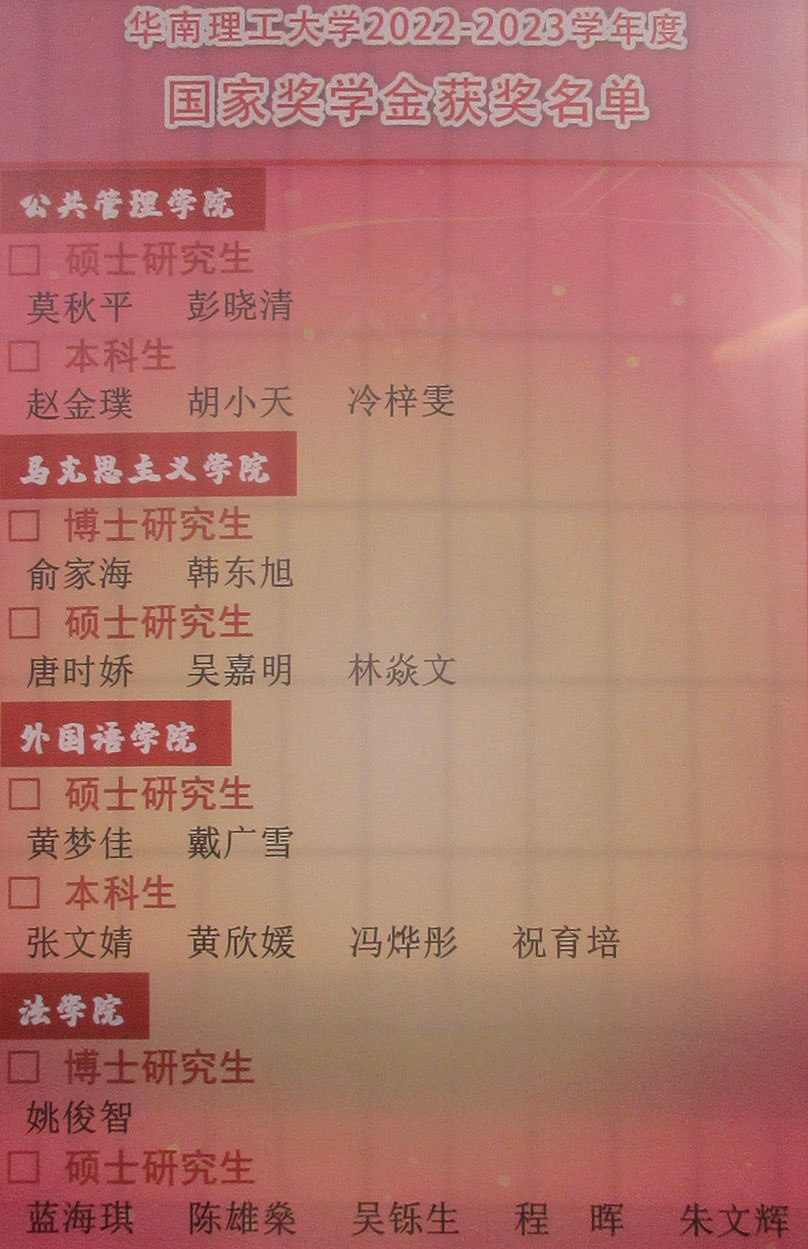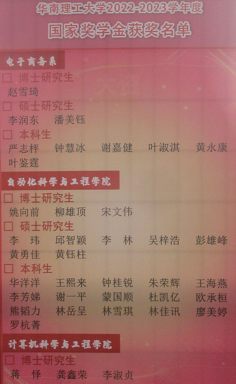 华南理工大学2022-2023学年度 国家奖学金获奖者