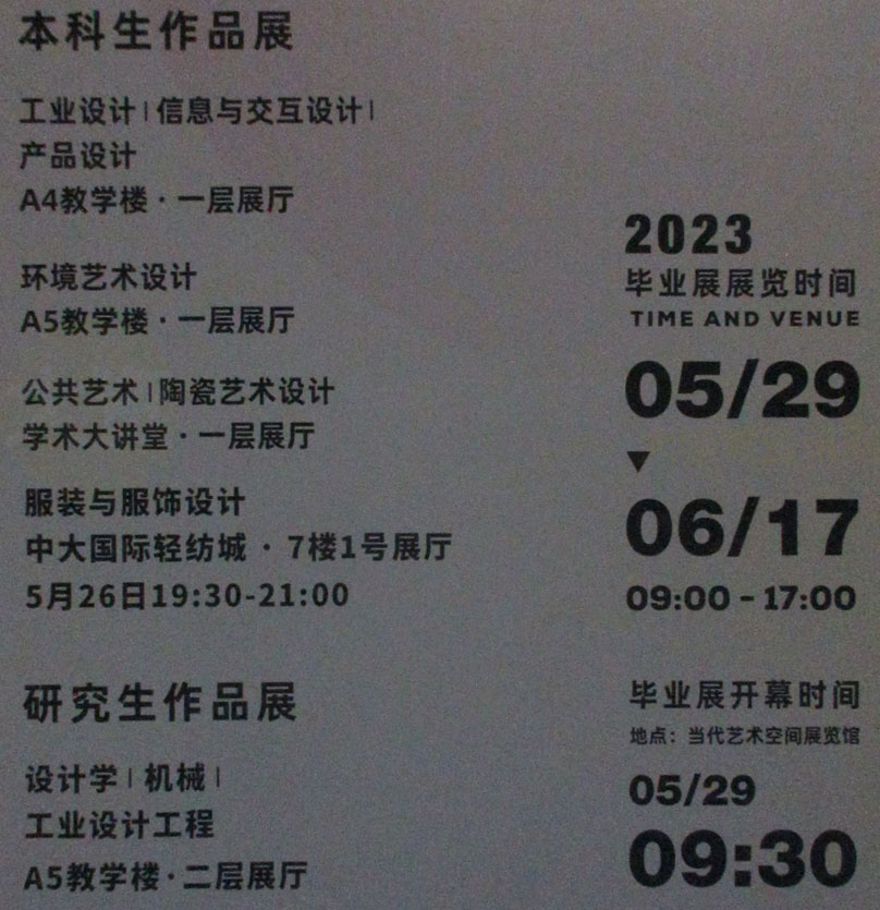 华南理工大学设计学院今年的毕业生作品展也已经于2023年5月29日开始展出 展期有20天之久 具体展位展场分布于学术大讲堂一楼以及A4和A5的一二楼展厅