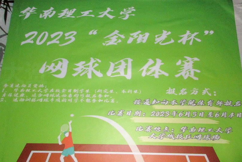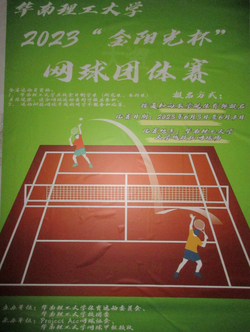 华南理工大学2023金阳光杯网球团体赛 按通知向本学院体育部报名 比赛时间2023年6月3日至6月4日 比赛场地-大学城校区网球场
