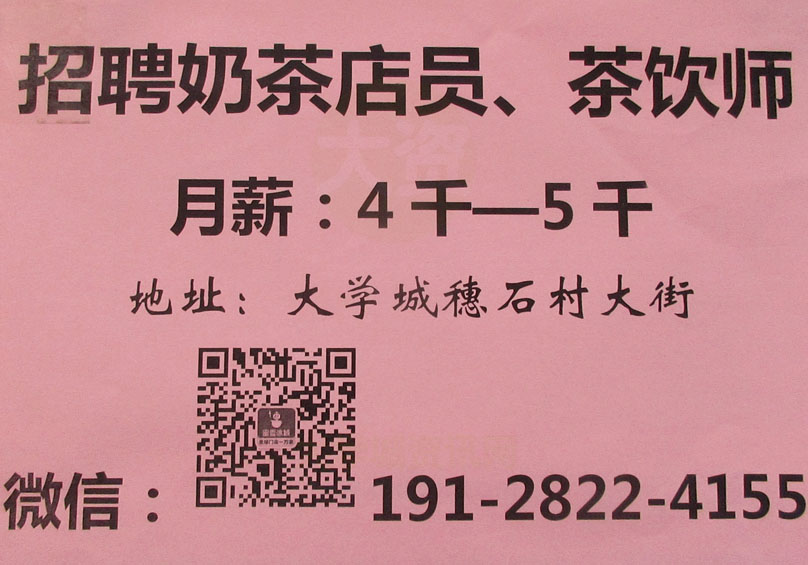 穗石村·东门广场 蜜雪冰城 招聘奶茶店员、茶饮师 月薪4千-5千 微电19128224155 |