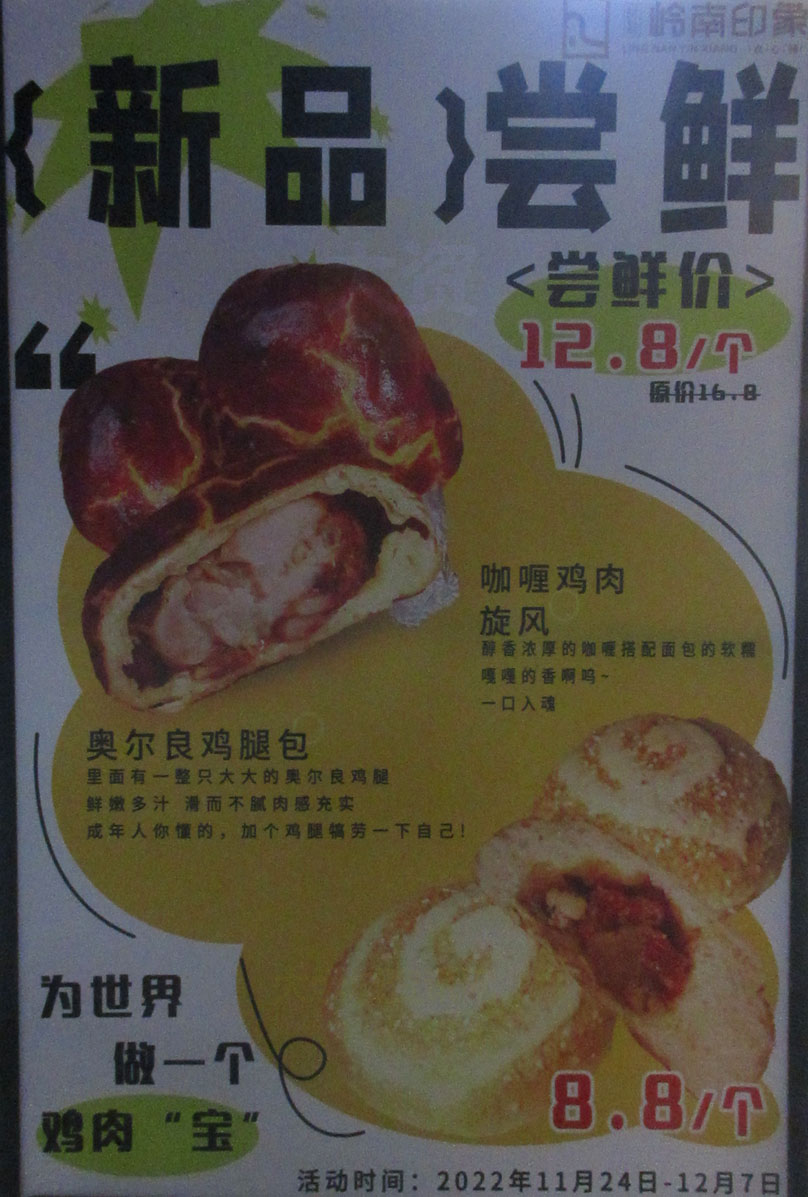 穗石大道南端 大利家超市正门旁 岭南印象蛋糕店 新品尝鲜 奥尔良鸡腿包12.8元1个 咖喱鸡肉旋风8.8元1个 活动期2022.11.24-12.07 | ||||||