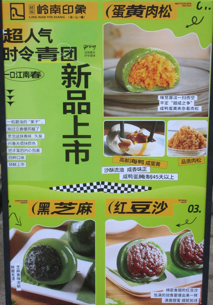 穗石村穗石大道西南端 岭南印象 青团系列新品上市 蛋黄肉松&黑芝麻&红豆沙 多种馅料口味;麻薯Q盒推荐 蛋黄流心味&紫薯芋泥味 | ||||||