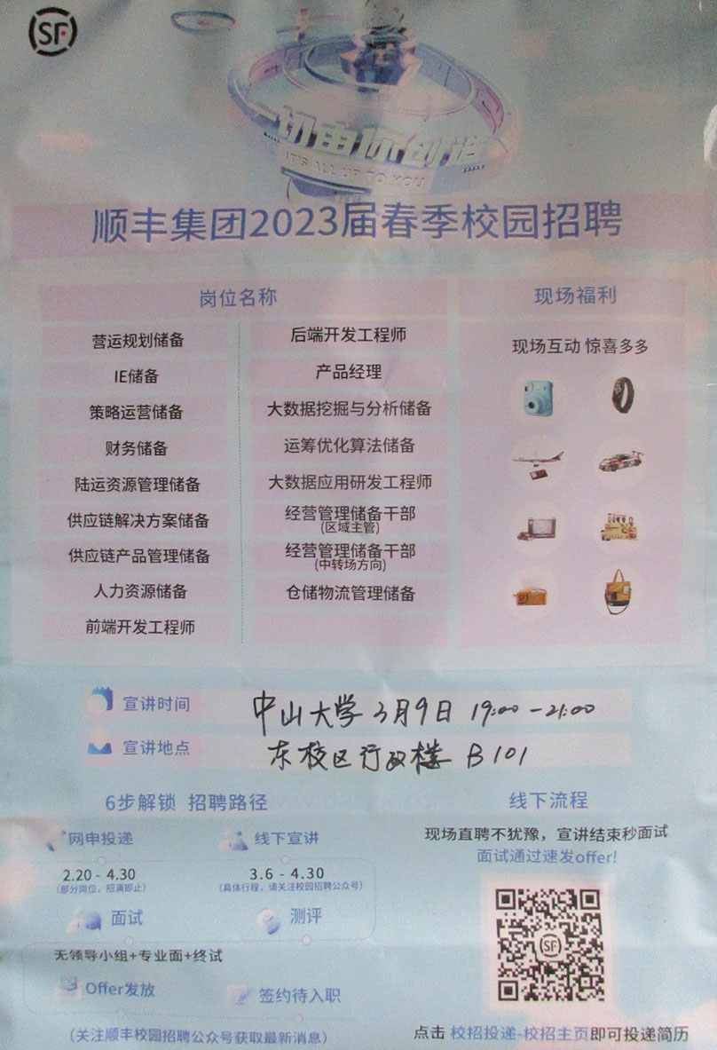 顺丰集团2023届春季校园招聘 中山大学3月9日晚19点-21点 教学区行政楼B101 现场互动不少福利奖品赠送 |