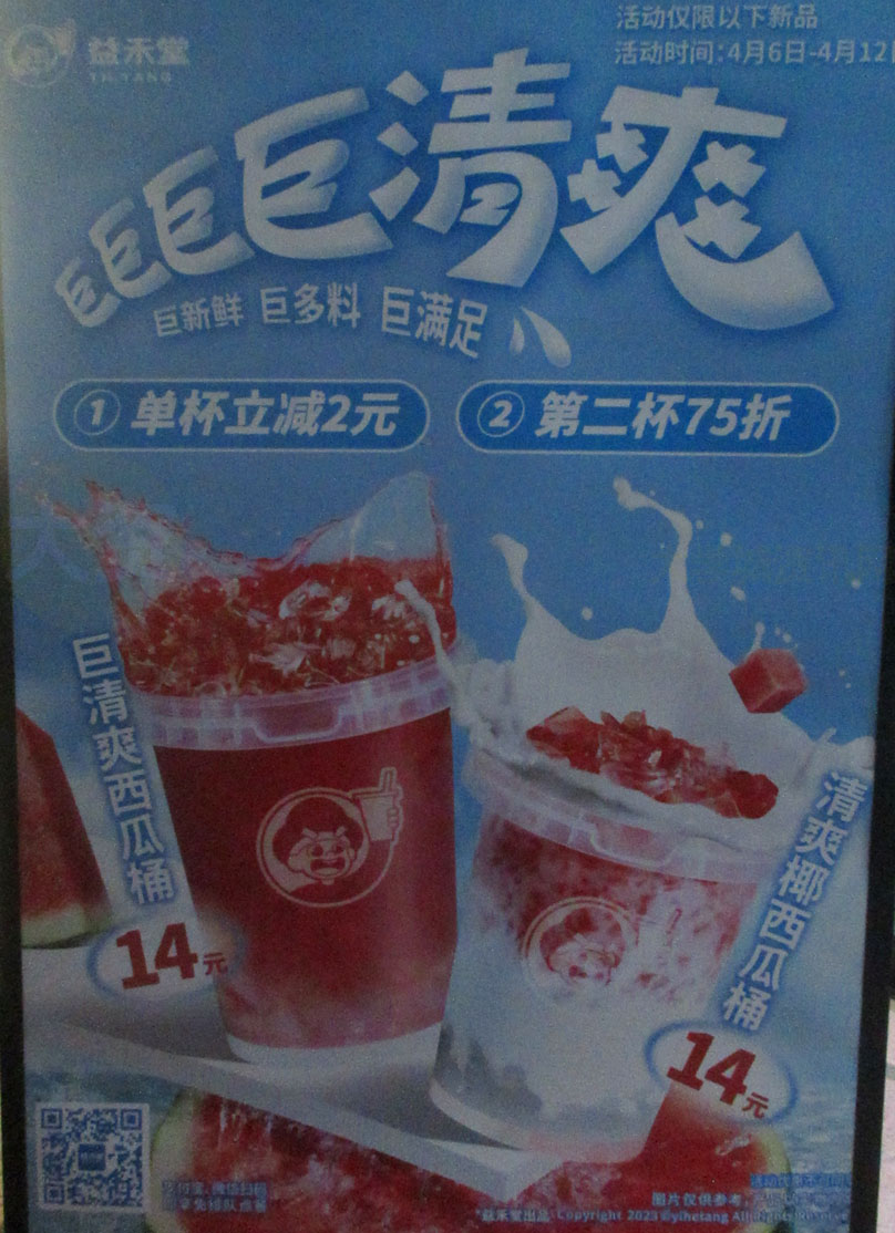 中大生活区至善园4栋一楼北西侧 益禾堂 新品-巨清爽西瓜桶14元、清爽椰西瓜桶14元,4月6日-12日,以上新品单杯立减2元,第二杯7.5折 | ||||||
