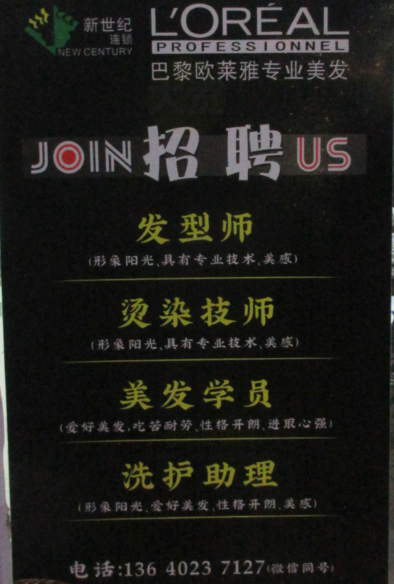 中大生活区明德园6栋北列西 巴黎欧莱雅美发店 招聘发型师,烫染技师,美发学员,洗护助理 | ||||||