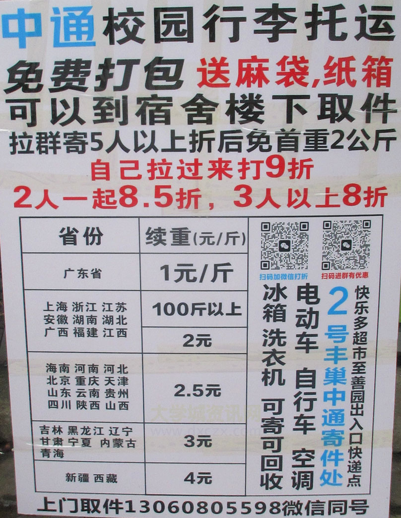 中通校园行李托运&不同地区续重价格详细 免费打包 可到楼下取件 具体拼团等优惠:群寄免首重,两人8.5折,3人以上8折,自提9折 微电13060805598 |