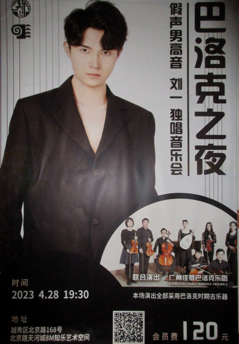 巴洛克之夜 假声男高音 刘一 独唱音乐会 时间2023.04.28周五晚19点30 越秀区北京路168号天河城8M知乐艺术空间 会员费120元 |