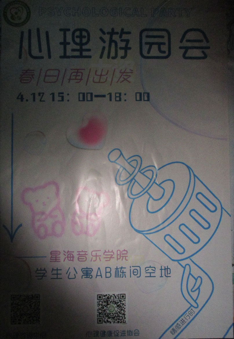 春日再出发·心理游园会 4.12周三下午15点-18点 生活区公寓楼AB栋之间空地 |