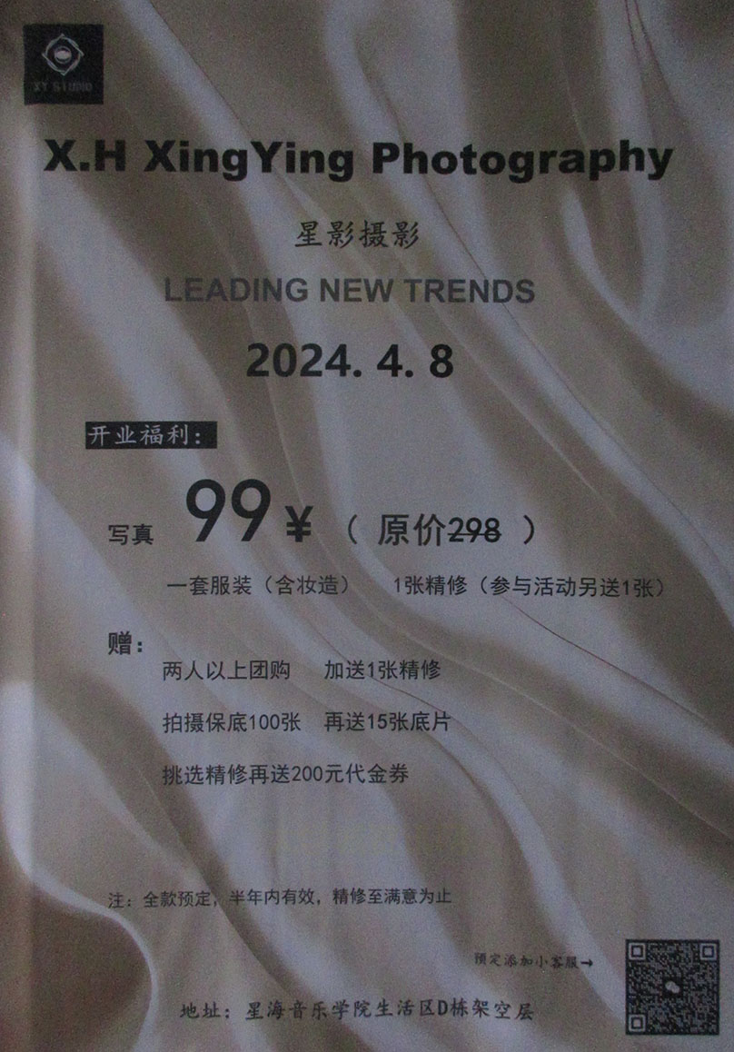 星海-星影摄影2024.4.8开业福利 写真99元原价298元 生活区D栋架空层 | ||||||